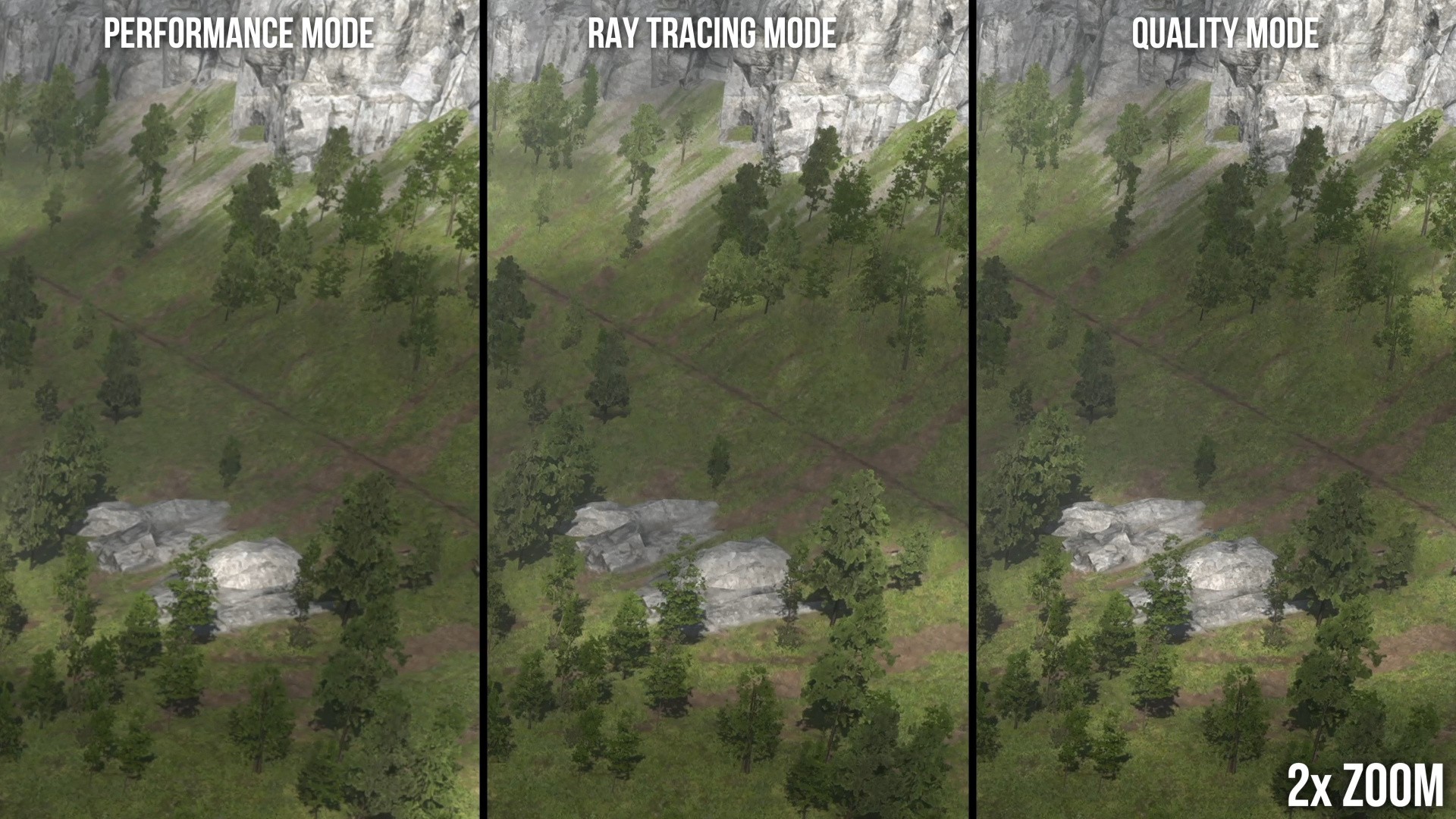Beyond those differences, the only visual differentiator between the modes is image quality. In stills, the RT and quality modes look very similar, with a fairly 4K-like presentation. The performance mode is softer and visibly less detailed in comparison, though it's not a massive difference. AMD's FSR2 is mostly likely used to reconstruct a lower resolution image into a higher resolution one, and the amount of scaling does vary per mode. Performance mode is typically around 900p internally, RT mode is usually around 1000p or so, and quality mode clocks in at about 1296p in most shots I tested. The pixel count did seem to vary on a frame-by-frame basis so dynamic resolution does seem active as well.