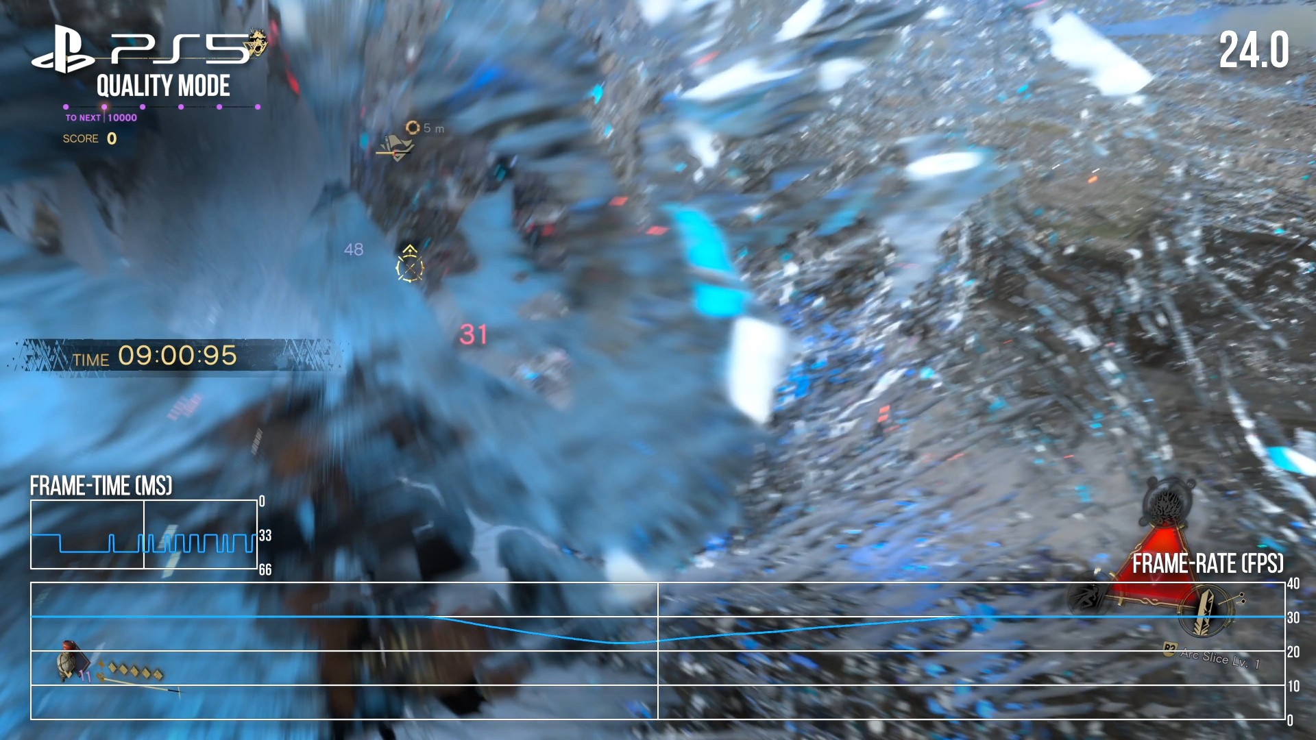 Frame-rates in this demo are unstable, though this isn't unexpected for an early sample that is likely based off of old code. In the performance mode Forspoken is frequently dropping frames during traversal, and is very often sub-60fps during battles, with readings around 40fps at worst. The quality mode and ray tracing mode are more consistent, though they target 30fps. Traversal is a solid 30fps in those modes, and battles are mostly 30 though they do drop significantly at times, with both modes hitting similar framerates in intense moments.