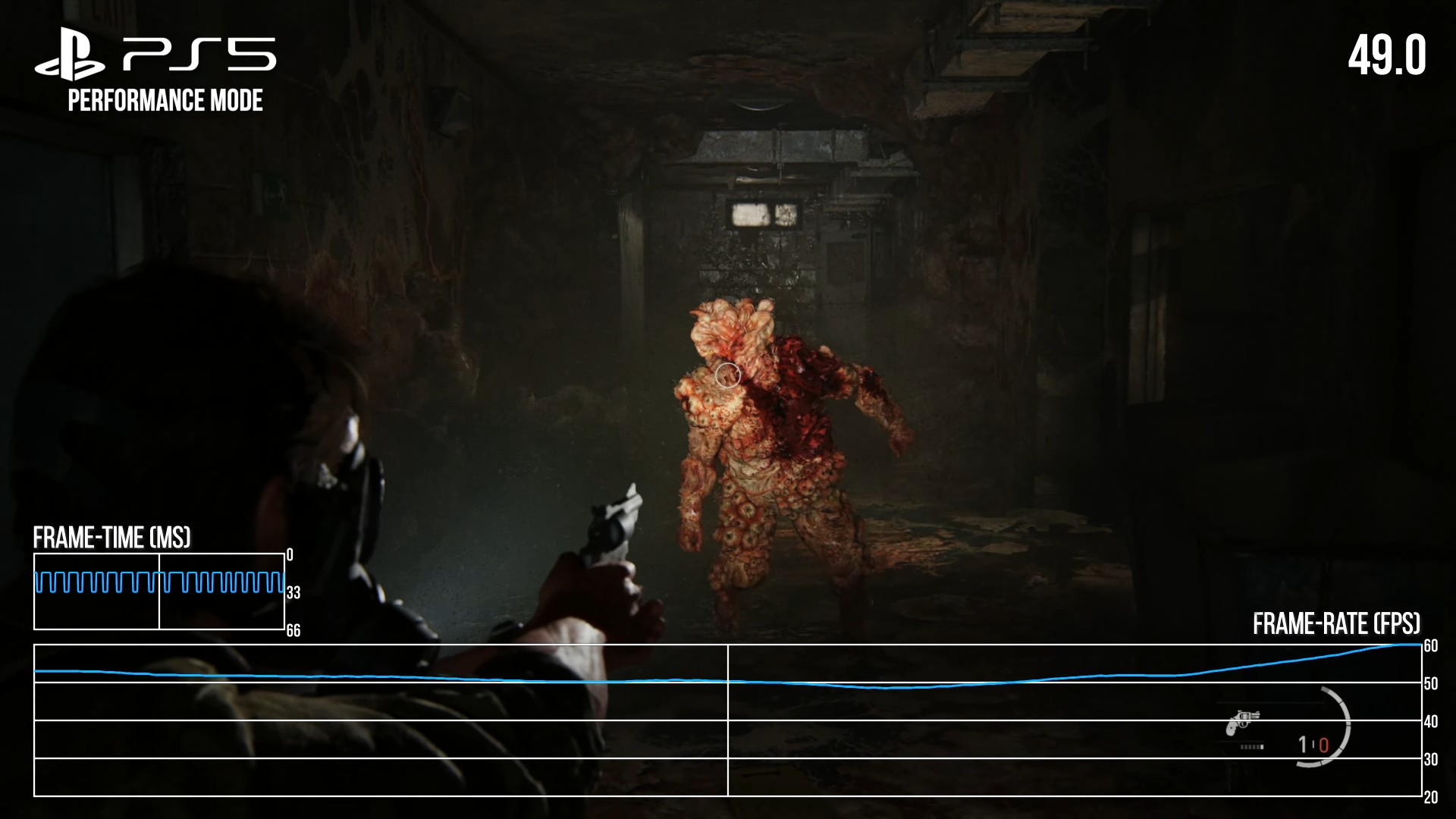 So let's unravel these options, starting with the 4K output performance mode. Thankfully, results here are very straightforward. Essentially, this performance mode offers a very convincing 60fps update. If you've played The Last of Us Part 2 on PS5 you'll have a good idea of what to expect: a very smooth and stable 60fps even in intense scenes, with only five instances of frame-rate drops in gameplay and only one that proved actually disruptive - a hallway encounter a third of the way through the game that repeatedly produced frame-rates in the 50 to 55fps range. The game's cutscenes do drop one frame in advance of camera cuts so the engine can generate a spare frame to use for TAA, but this is difficult to notice in the performance mode.