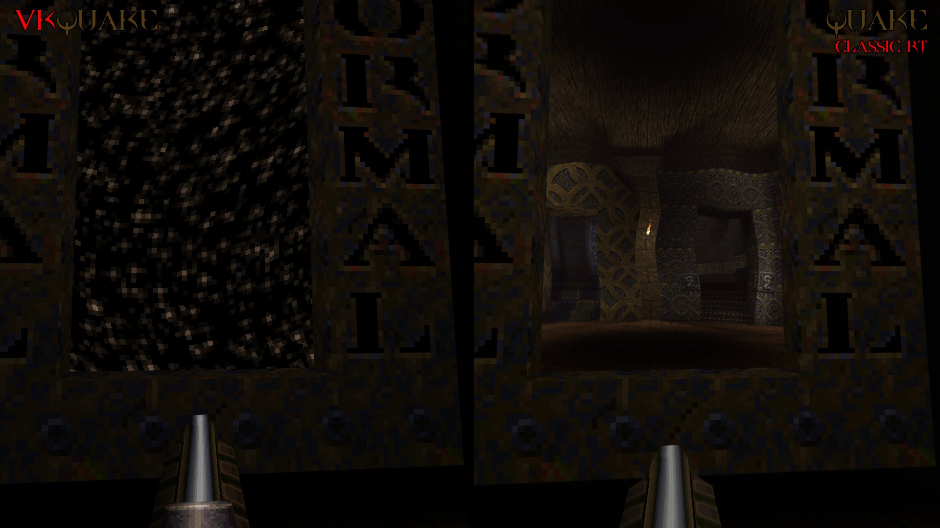 The classic renderer uses ray tracing for all the primary rendering of geometry, but the lighting is still processed through texture-based light maps like the original game, meaning you get similar lighting and ambience, with some intriguing RT effects: water surfaces are completely different, with RT reflections that show the full surroundings. You also get RT-specific view distortion effects when under water too. A really nice upgrade comes from the teleporters, which now show you the area you'll arrive in when you travel through, Portal-style.