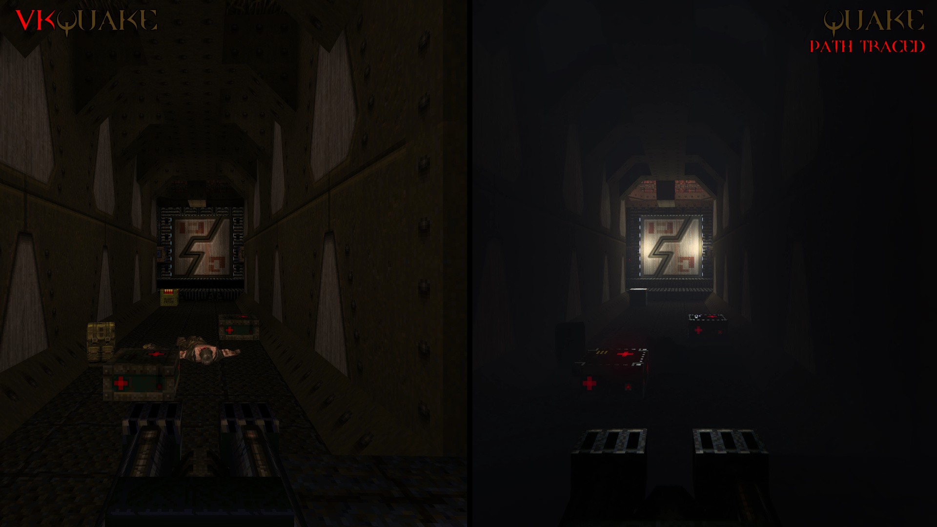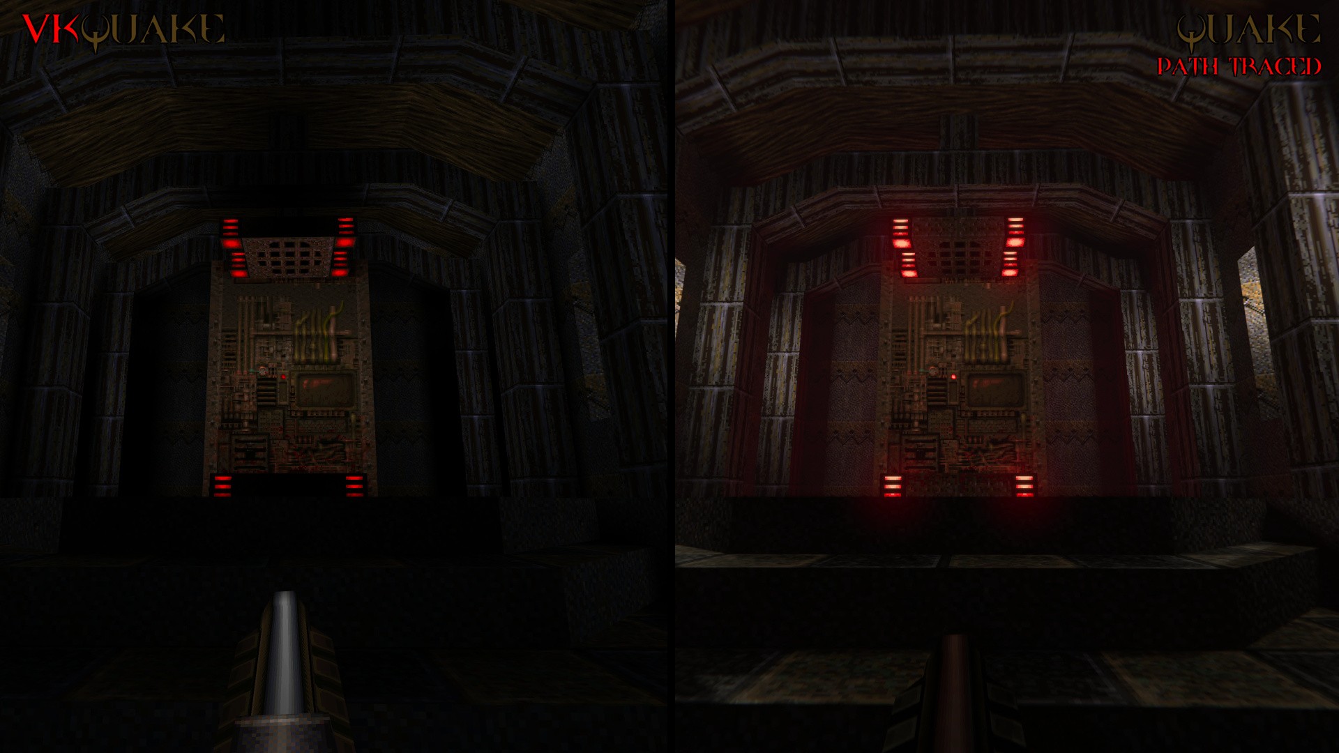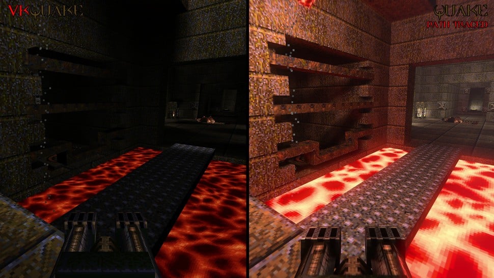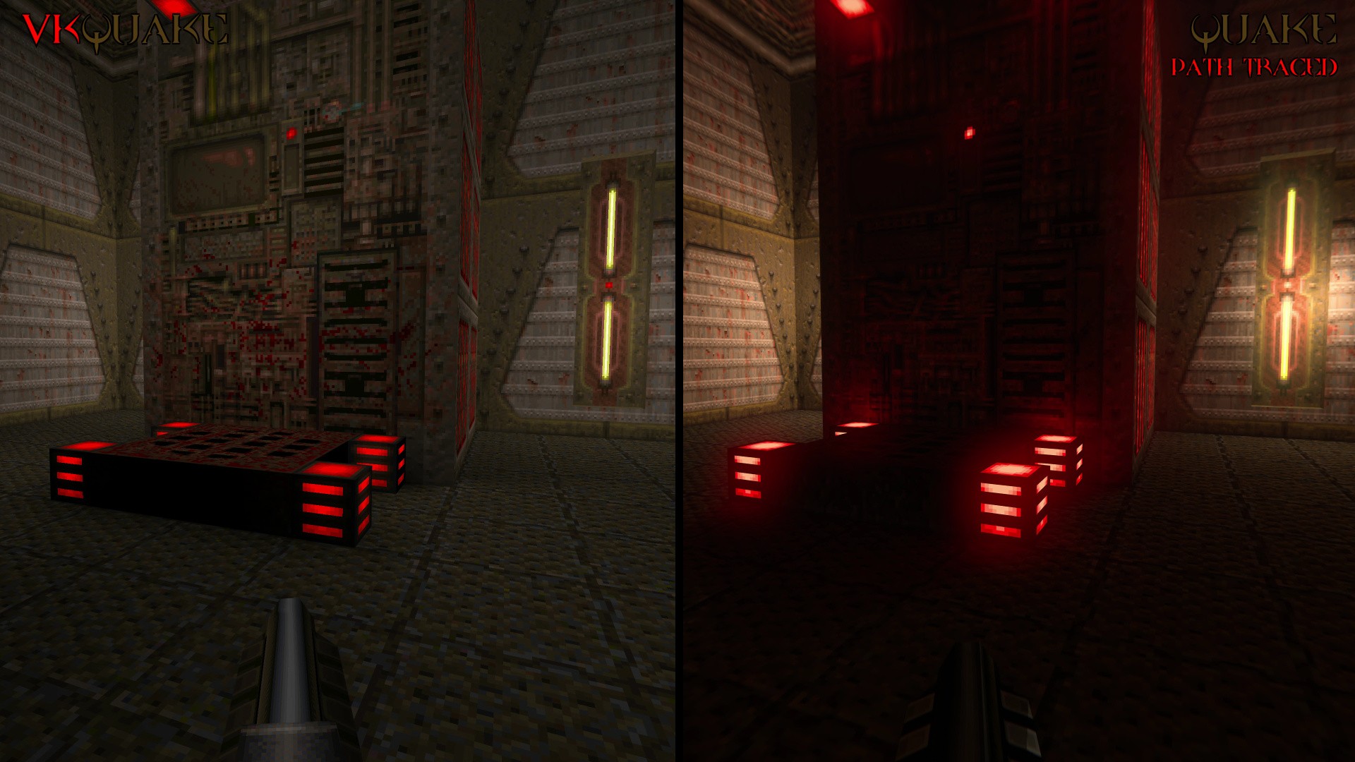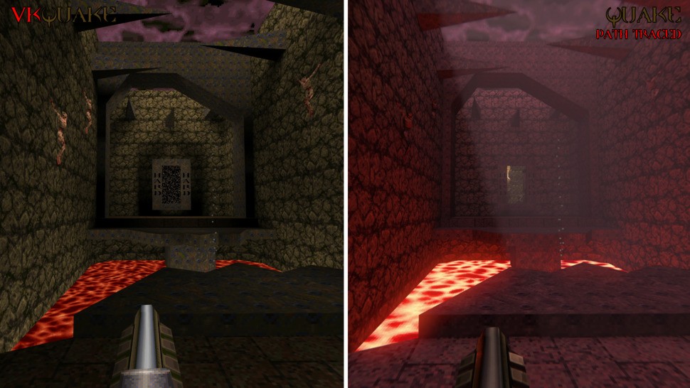 One of the biggest changes is the use of emissive lighting surfaces, something only possible with RT. Teleporter pads with their little red lights cast light and shadows on nearby surfaces - confirming that coloured lighting is also added, something missing from the original Quake. Lava is an emissive light source too, of course, dramatically transforming many scenes.