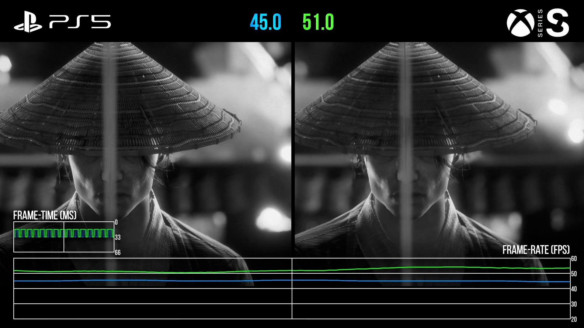 All systems get a great-looking game then but performance is problematic as Trek To Yomi runs with an unlocked framerate on all console platforms. On current-gen, we're generally seeing a read-out between 40-60fps in typical gameplay. PS5 and Series X spend a lot of time around 40-55fps - a sort of frame-rate no-man's-land if you will, with constant stutter on a conventional display. Series S, curiously, has a substantial frame-rate advantage, typically leading the more powerful machines by around five frames per second in matching footage. However, none of the consoles feels particularly good to play, exacerbated by the constant lateral movement inherent with a side-scrolling camera. So yes, this is another game - like Elden Ring - that runs at an unacceptable performance level even on the most powerful console hardware available.