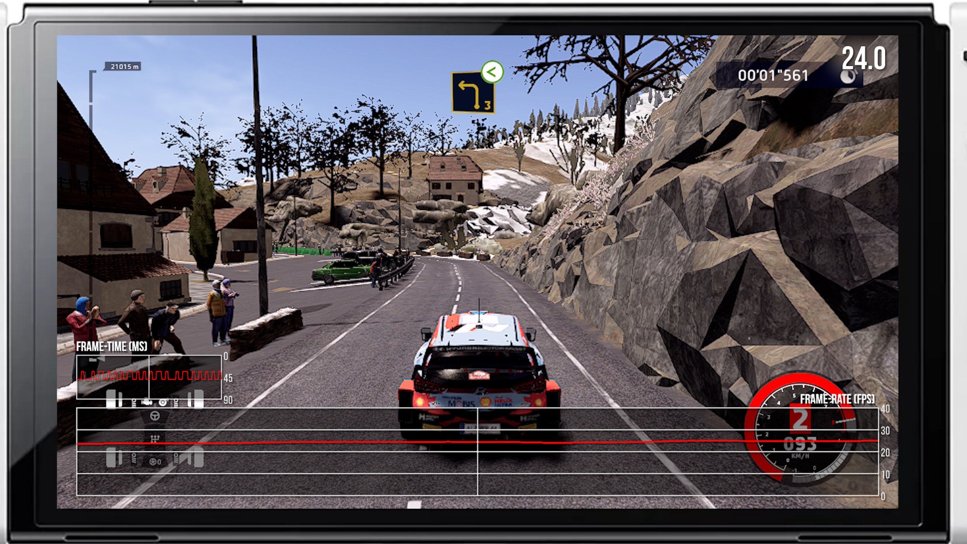 First, let's take a look at the headline visual stats. In the base PS4 release, WRC 10 runs at 1080p and 30fps, with TAA to clear up any lingering rough edges. On Switch, in order to fit into the system's much smaller power budget, image quality is reduced to a dynamic 1600x900 for docked TV play. The full resolution isn't often reached, with even the car exhibition mode running natively at 720p instead, and resolution drops to 1152x648 for some stages. And at 648p, the upscale to a full HDTV isn't flattering. For portable play, resolution goes lower still to match the drop in GPU clocks, with 480p resolution typical - although a native 720p resolution is possibly achieved too. The low resolution in either mode is compounded by Switch's lack of effective anti-aliasing to address those jagged edges - besides optional motion blur in the menus.