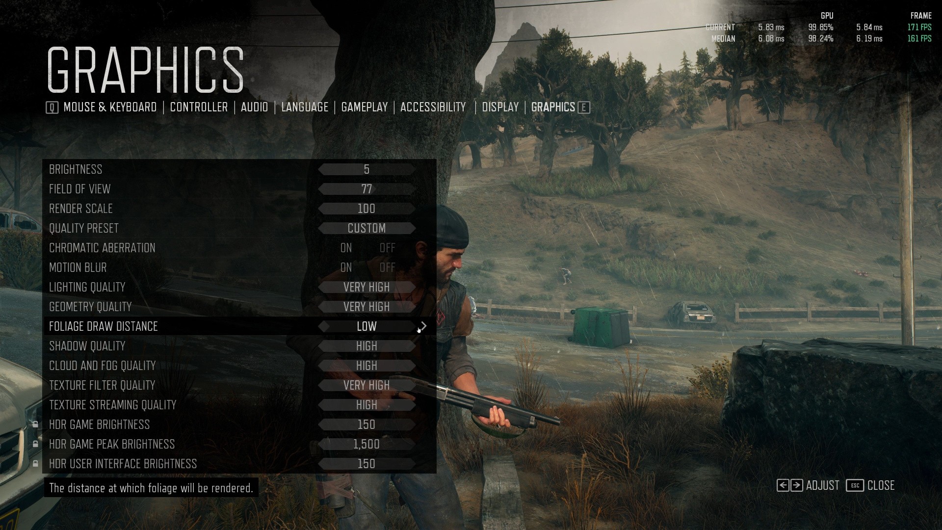 A narrow field of view is often found in console games to create claustrophobic moods or to save on performance - and can literally make PC users sick. A field of view option makes the game actually playable for many users where the default FOV might have been too narrow. Once again, the Days Gone menu system is a joy to use here - as you tweak the FOV variable, the view in the background changes in real-time, allowing the user to tweak to their precise preference.
