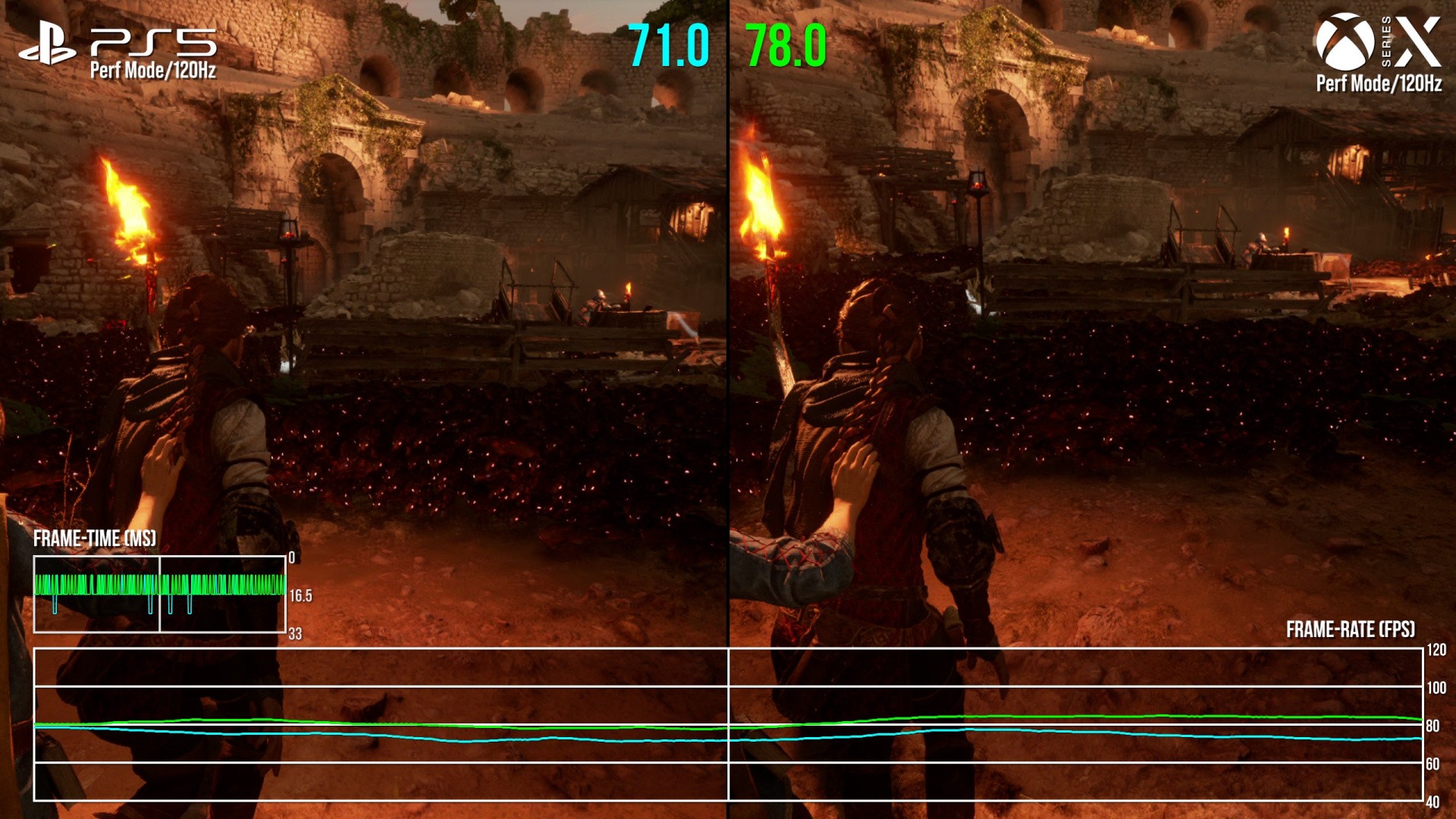 On top of the successes of the 60fps performance mode, there's a surprise extra on update 1.5 here. In hooking your PS5 or Series X up to a 120Hz display instead, this mode runs with an entirely unlocked frame-rate. Potentially this lets the renderer go right up to the max 120fps as well, in rare instances - in select cut-scenes, too. But in general gameplay, we're more often looking at between 70fps to 100fps - occasionally dropping into the mid 60s during the opener around the castle ruins. It's honestly fascinating to see this included, and gives an insight into where the biggest stress test areas are. Into just how wide, or narrow, the clearance is above the 60fps line when running at 60Hz. Another curious twist here is, the rat animation refresh changes to at 60fps instead, so long as either console outputs at 120Hz.