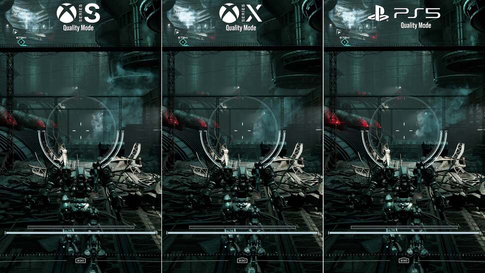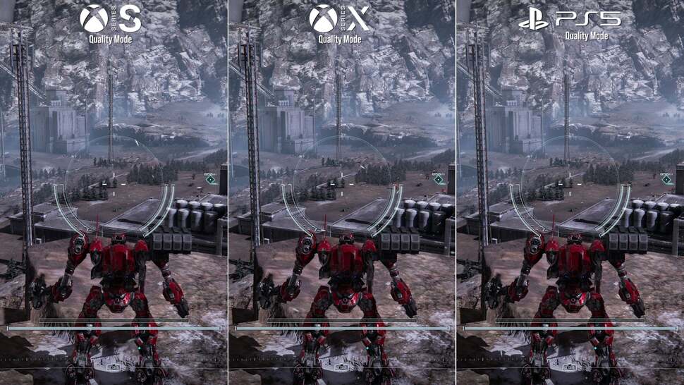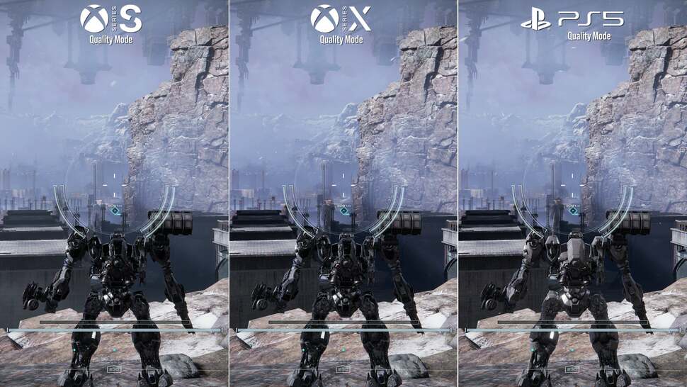 All of which leads us to the key topic of performance, where Armored Core 6 runs with an unlocked frame-rate in both quality and frame-rate modes - but with an at times loose grasp on the target 60fps. Looking at quality mode, potentially there's scope for PS5 or Series X to hit the top 60fps line by looking directly up at the sky - but that's all. Sadly, the fixed 4K resolution on each console, the higher-grade shadows, drag the frame-rate into the 30-45fps region during any real action. The game runs at its best around the opening hangar area, closer to the 45fps lin, but the net result is that even a VRR-supporting display will struggle to hide the perceptible judder from sub-40 drops. Worse still, the game is also prone to lurches into the high-20s. I've barely scratched the surface of Armored Core 6's huge campaign - but the climax of the Strider battle has a huge sub-30fps stress point on both PS5 and Series X.
