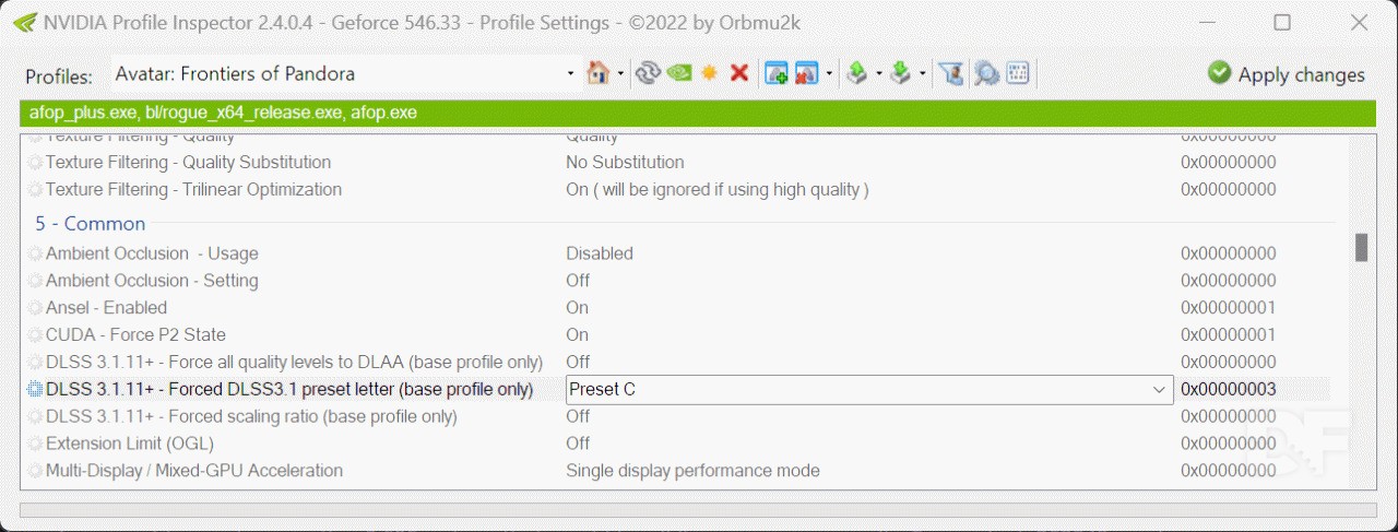 More significant is the choice of the default DLSS 'D' model for Avatar, which causes some smearing in certain light and movement scenarios. If you experience this, you can try using the 'C' preset instead using nvidiaProfileInspector with this XML file placed in the Profile Inspector directory - or, alternatively, by replacing the default DLSS .dll file in the game's install directory with version 2.5.1 available at TechPowerUp. I'd love to see the 'C' preset become the default option in a future game patch, along with a fix for the cloud and water issues.