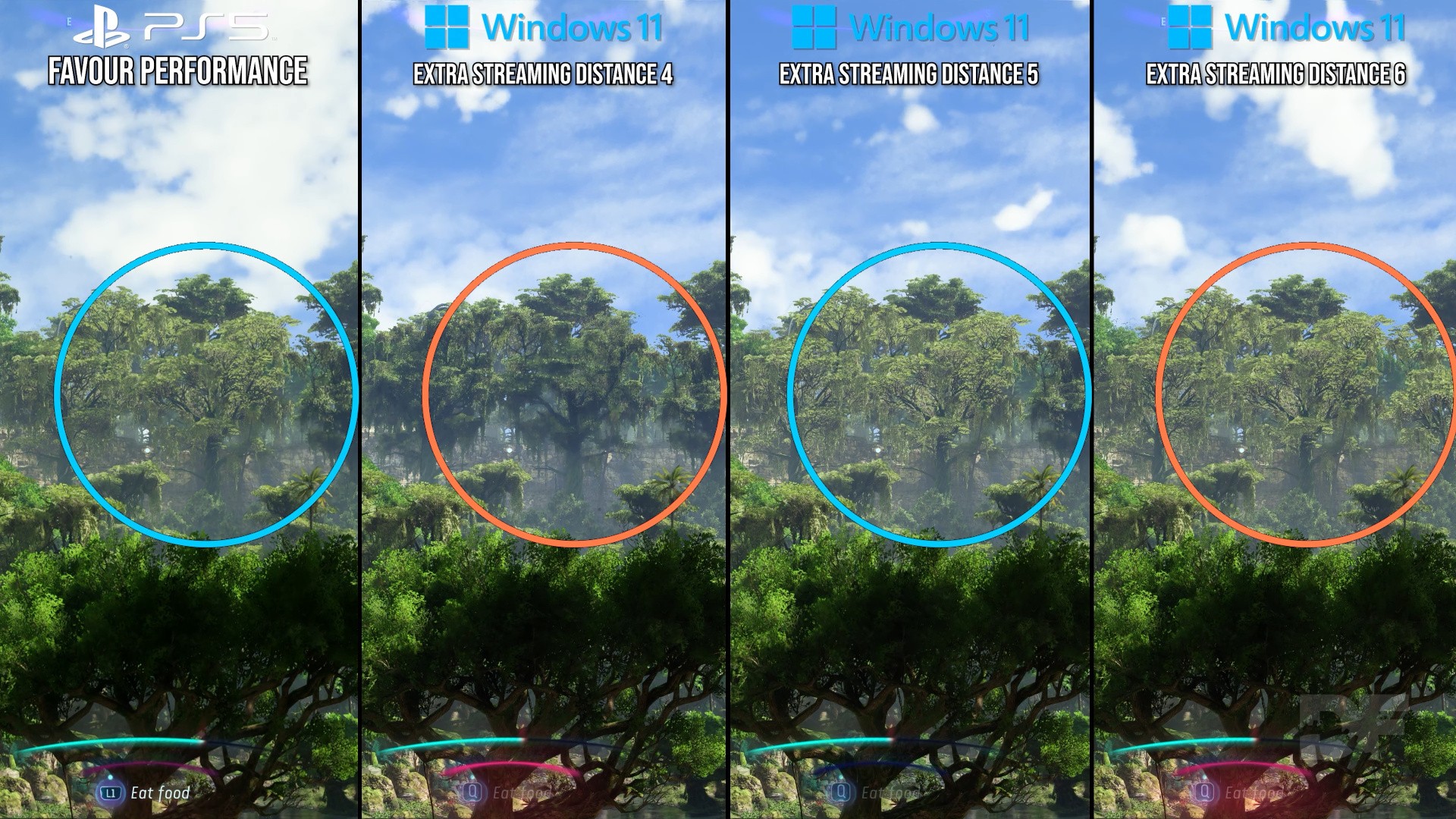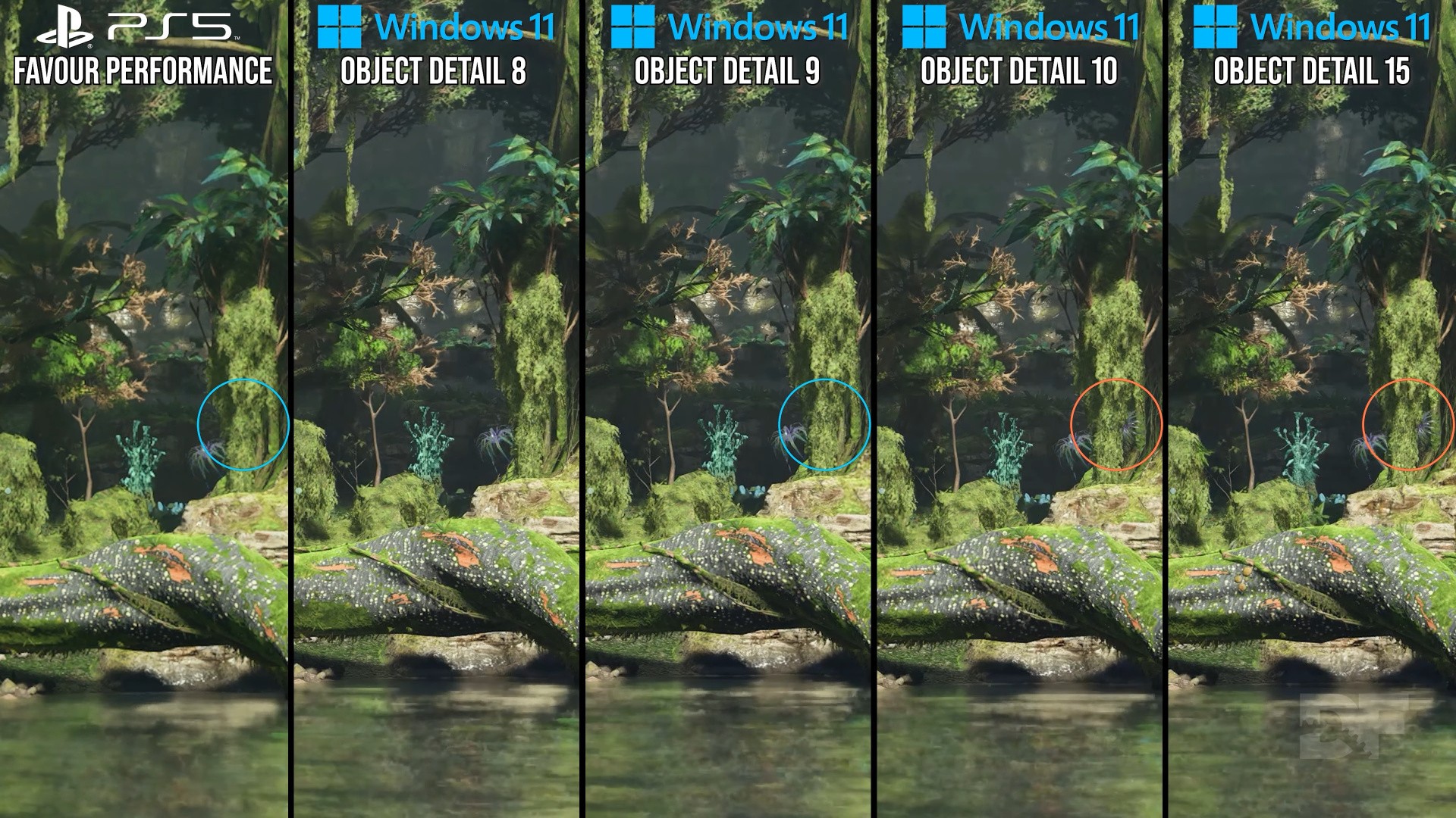 One of the most important optimisations is the extra streaming distance setting, which determines the range at which large objects like trees transition from real geometry to imposters. PS5 seems to use the '5' setting, and I also recommend this for optimised settings. Similarly, the object detail setting on PS5 appears closest to '9', and we'll adopt that on PC for our optimised settings too. This claws back 14 percent of extra performance versus the highest '15' setting, while still offering minimal pop-in while exploring Pandora on foot.