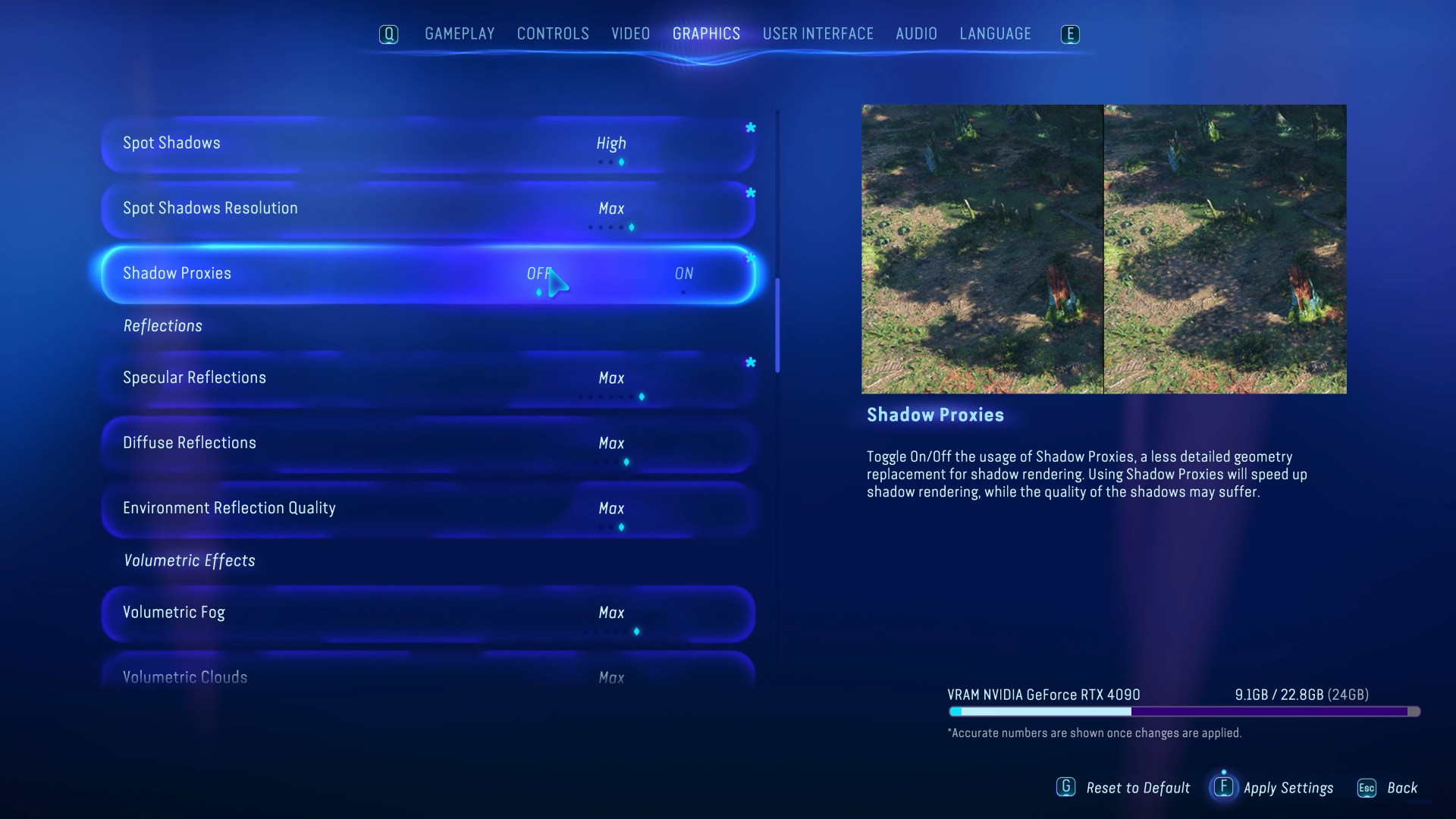 For specular GI or reflections, the max setting does not seem to increase resolution beyond that which is already offered by the ultra mode - in my testing, the amount of specular aliasing as we see here seems to be roughly the same as the ultra setting. When looking at very mirror-like reflections out of screen space, they resolve with identical levels of clarity, while very high is quite obviously lower resolution by comparison. However, the max setting for reflections does add skinned objects to reflections, which means things like soldiers, mechs, animals, Navi and more actually show up in reflections when not in screen space. This makes for fewer screen space errors in general and is a neat bonus for higher-end machines.