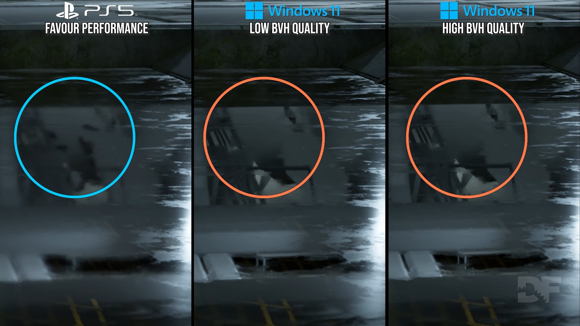 One example of a PS5 RT setting that cannot be matched perfectly on PC is BVH quality. In side-by-side comparisons it's easy to see that the PS5 has the same geometry roundedness and detail as PC's high setting, but when you look closer, you can see that some triangles are just completely missing on PS5 - which tends to leave little black holes in geometry in more mirror-like reflections, something not seen on any PC setting. Here, I find high to be perfectly cromulent for optimised settings.