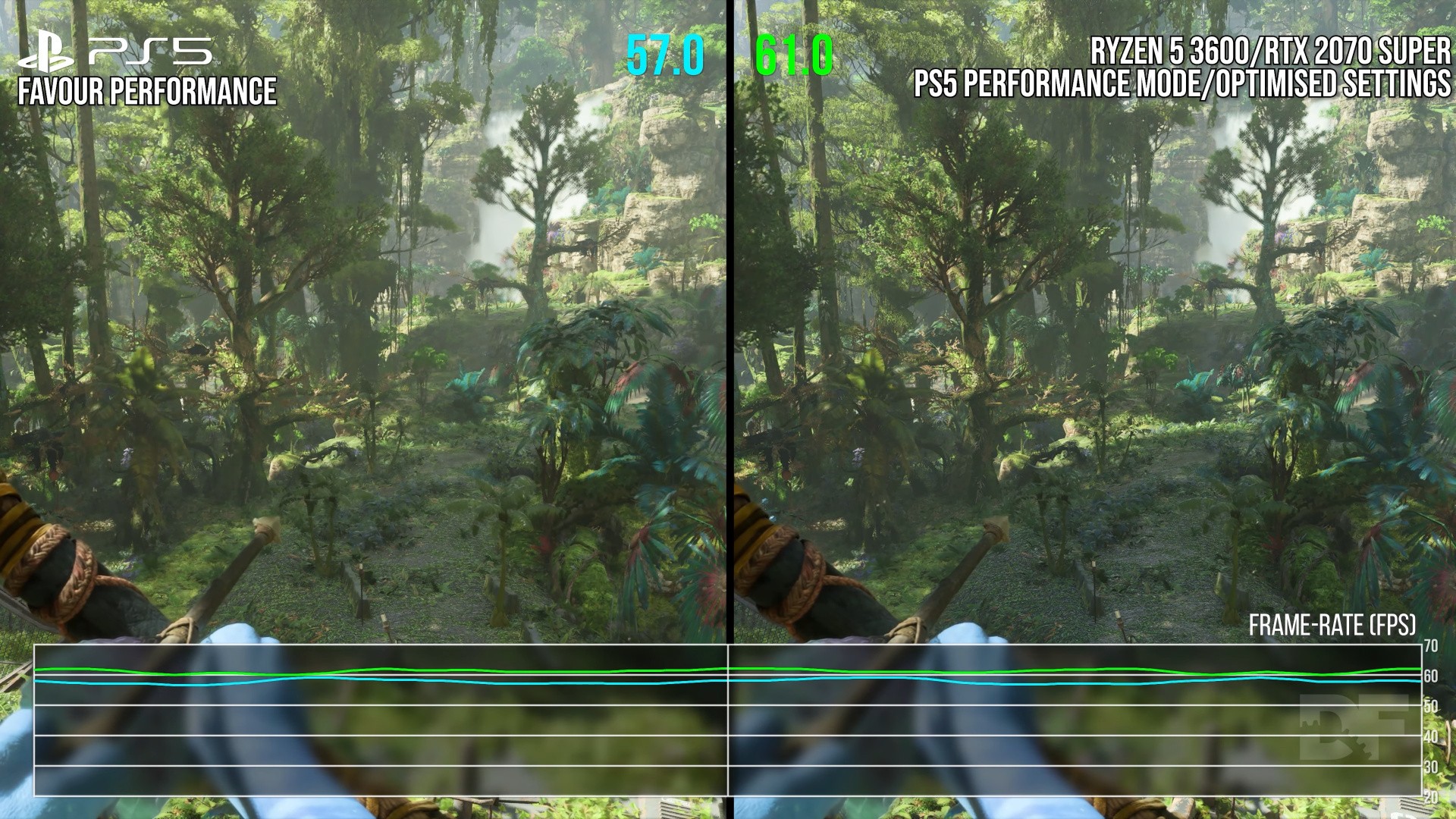 If we visit a spot where the PS5 is bottoming out at a 720p internal resolution with FSR 2, the RTX 2070 Super has a minor five percent performance lead - though, as discussed above and in our Avatar developer interview, the PS5 deploys extra optimisations to reach its frame-rate target.