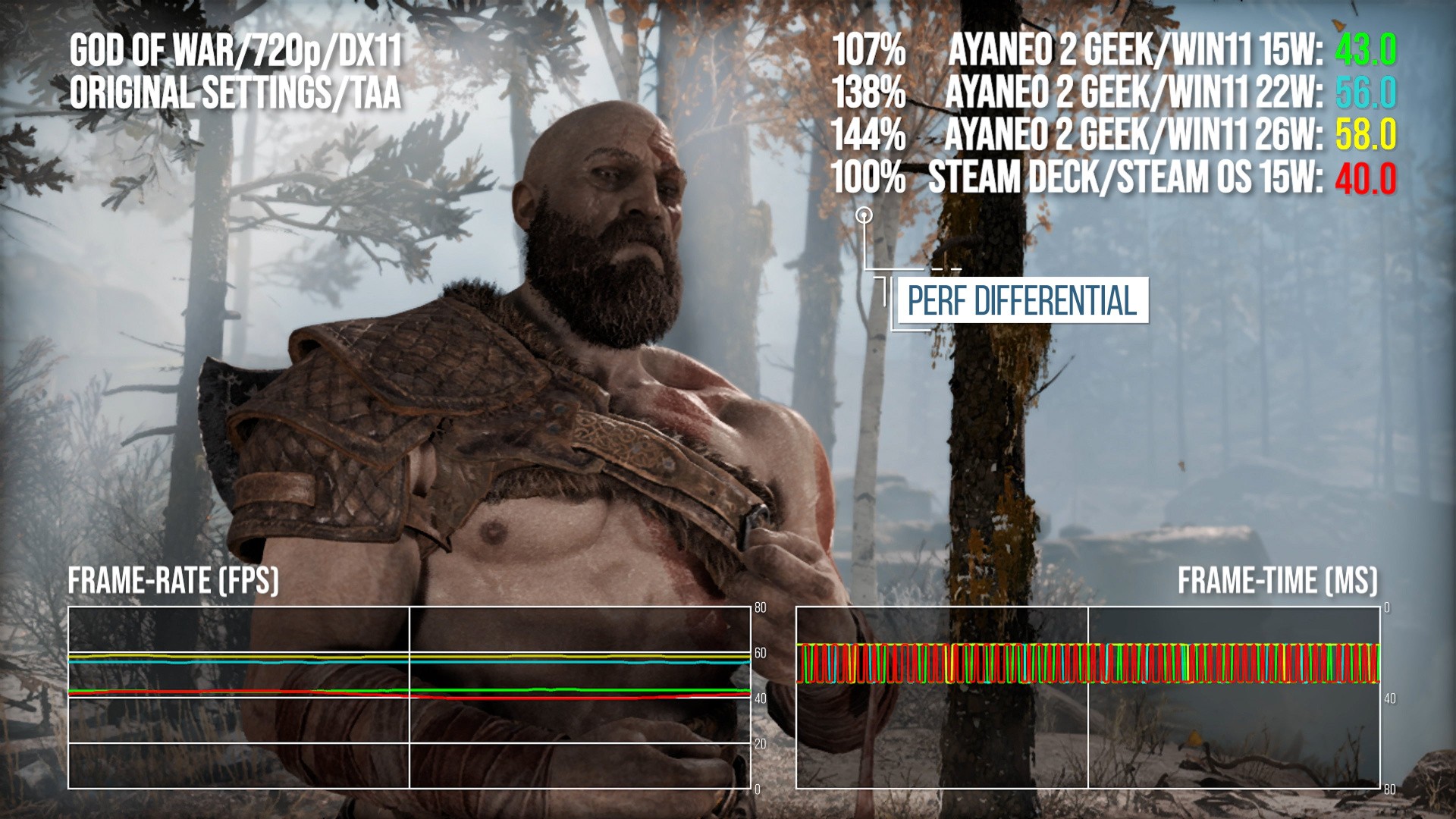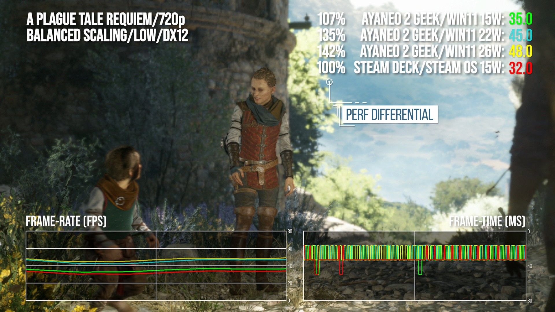 In the past, we've shown PC games running at matched settings to PlayStation 5 games too, with A Plague Tale: Requiem being the latest example, and in one test, I saw the AyaNeo Geek at 33W deliver 27 percent of the PS5's throughput in like-for-like testing. Dropping resolution vs PS5 sees frame-rate numbers creep up, but even at 720p (upscaling from 482p via TAAU) the PS5 at 4K upscaling from 1440p still ran around 10 percent faster. It's just one scene from one game, but an interesting test nonetheless. A Plague Tale: Requiem struggles on Steam Deck, but as you'll see in the video, I could achieve an effective 30fps lock in the game - and it looks phenomenal in handheld form.