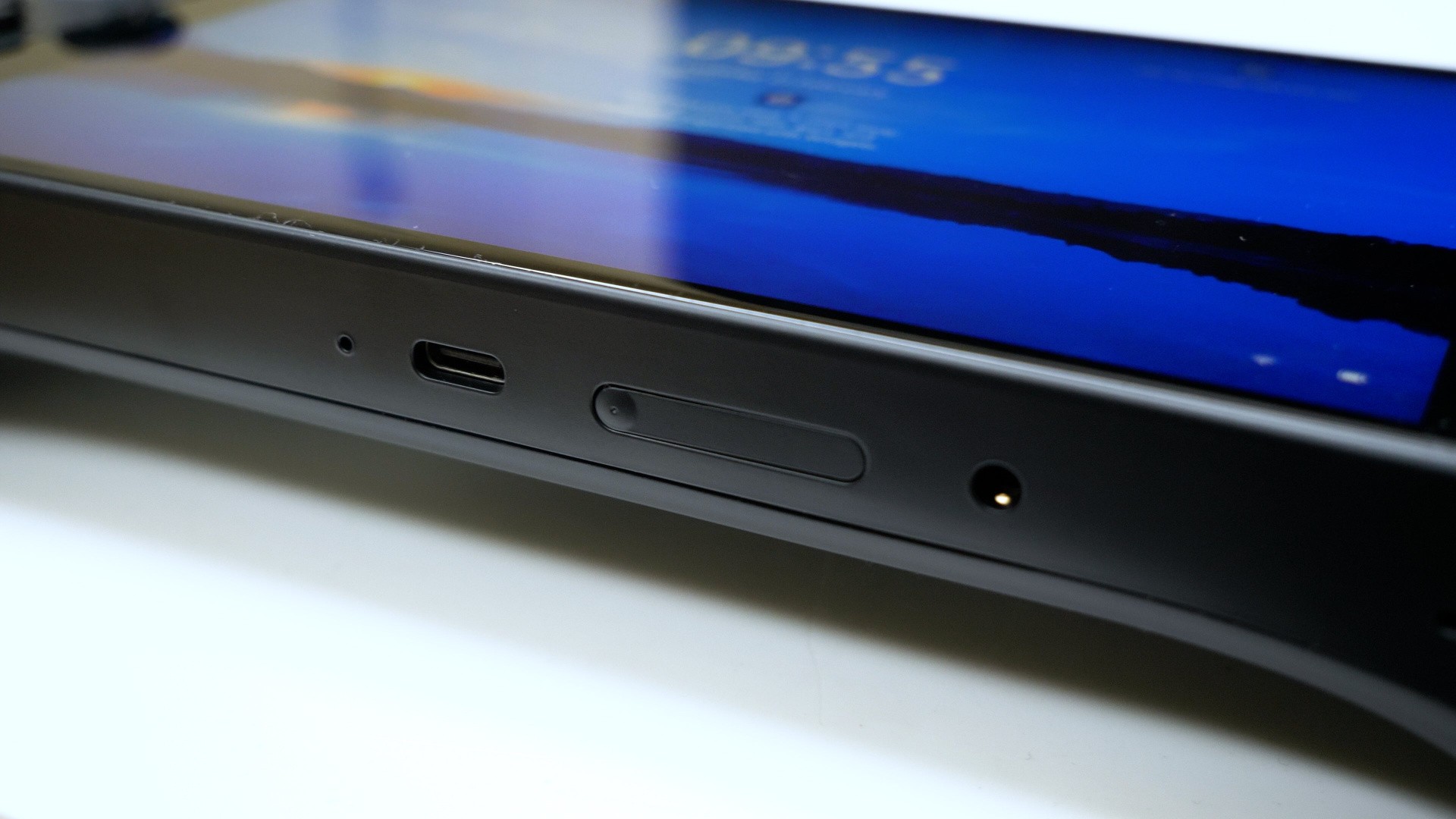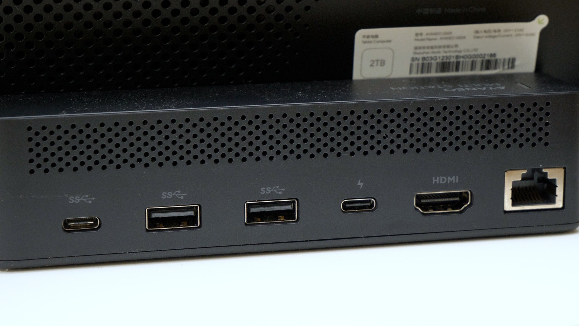 Returning to the form factor of the device, Steam Deck's singular USB-C gives way to three of them on both AyaNeo models - two on top, one on the bottom. Two of them have full USB 4 bandwidth to get the best from an external GPU hook-up if you want to go down that route, but ultimately just having more I/O options is extremely welcome. MicroSD and headphone jack are also included, naturally, as is a fingerprint reader and volume button. I was also supplied with the optional dock which offers HDMI 2.0 output (albeit with 4:2:2 chroma subsampling), two USB-Cs and two type As. What's interesting about this is that the main USB-C docking port at the front is adjustable, meaning this was as useful for my AyaNeo Air handheld as it was for the new models - as you can see in the hardware gallery on this page.