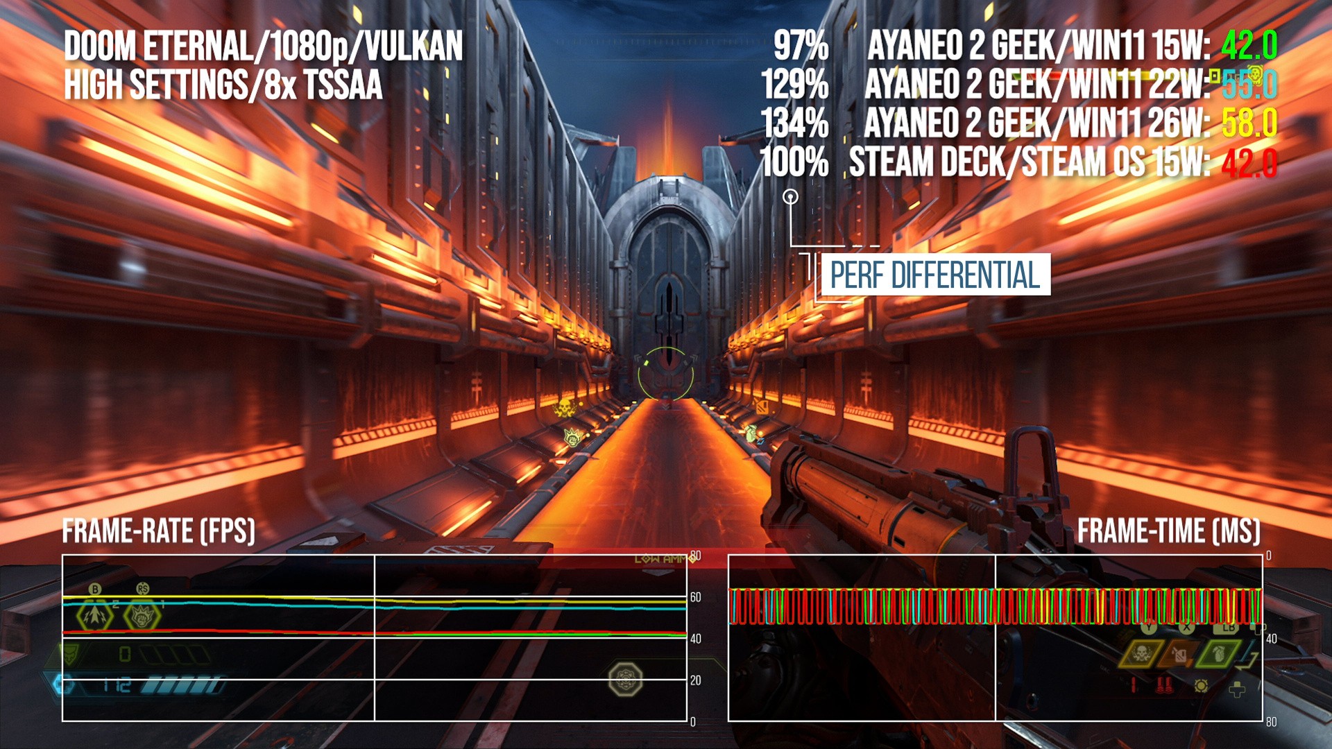 What you do get in the gallery are performance increments compared against Steam Deck running at its capped 15W - and there are some interesting surprises. First of all, despite its spec weaknesses, titles like Control and Doom Eternal can actually run faster than the AyaNeo handhelds when they're pegged to a matching 15W. That's because - remarkably - the open source Radeon driver used in SteamOS can have major efficiency advantages over AMD's own Windows equivalent. Once the extra juice is added though, the extent of the AyaNeo's performance advantage becomes evident. Even at 22W, a 35 to 40 percent performance advantage is commonplace - and that's a massive amount of headroom for powering past the limitations of the Steam Deck in the most demanding games. Moving beyond 22W, there is some extra headroom but it's best reserved for docked play, where you'll be plugged into the wall, unburdened by the already onerous battery life limitations.
