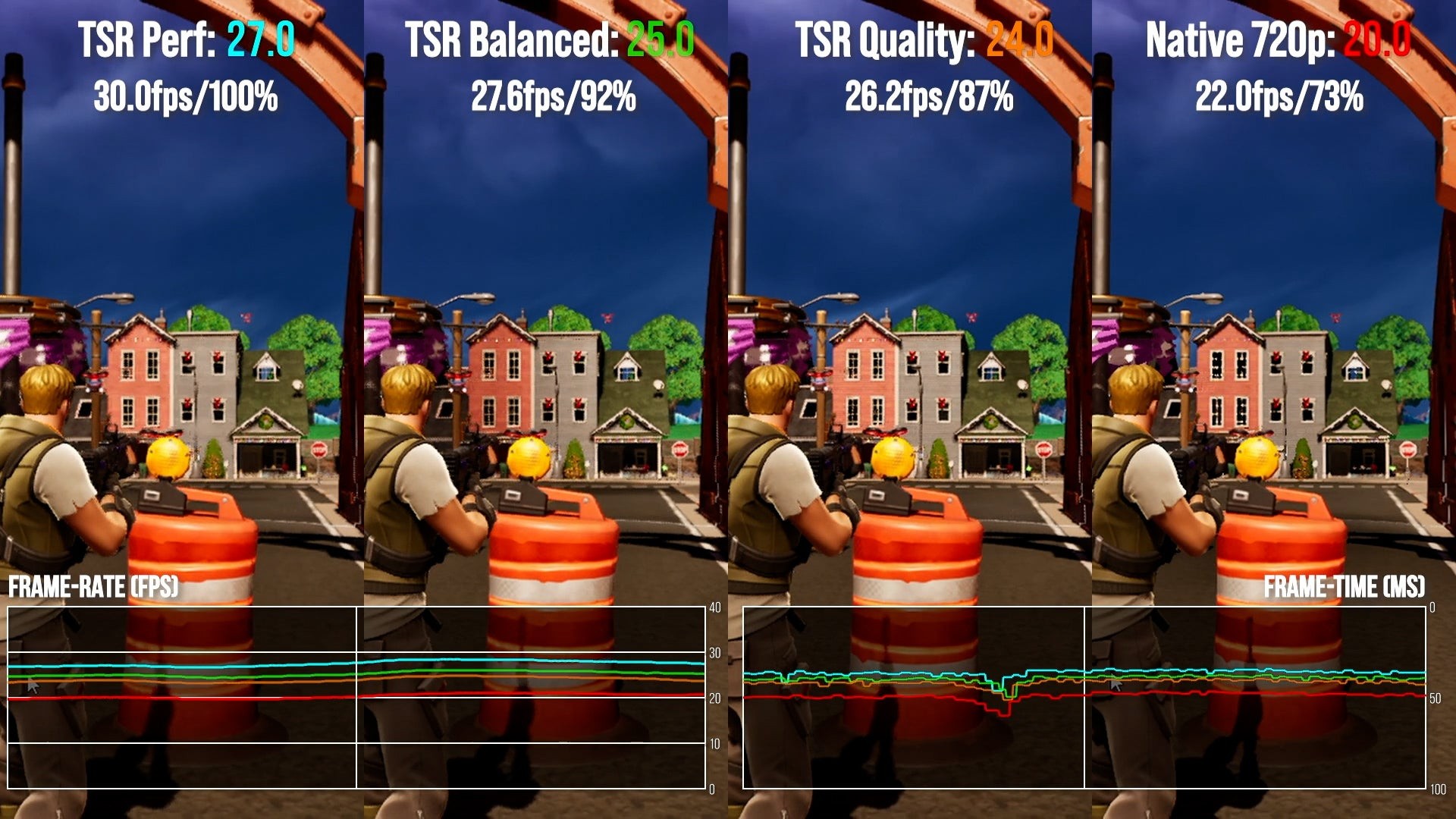 So, there's good news and bad news in terms of our overall results running Fortnite on the Deck. We can get close to 30 frames per second on Deck - even using hardware RT - but the bad news is that we need use temporal super resolution in performance mode to do it, meaning that - astonishingly perhaps - we're actually upscaling from 360p. TSR really is very impressive on the one hand, but on the other hand, I can't help but wonder whether we could get better image quality and more stable performance if we had the ability to use software RT, in line with the console builds.