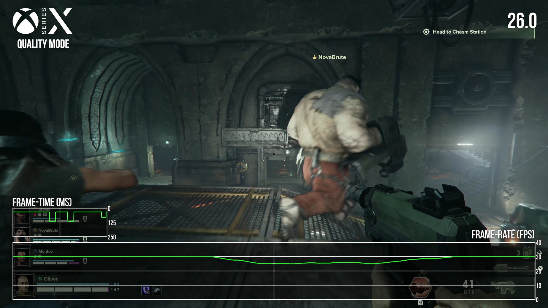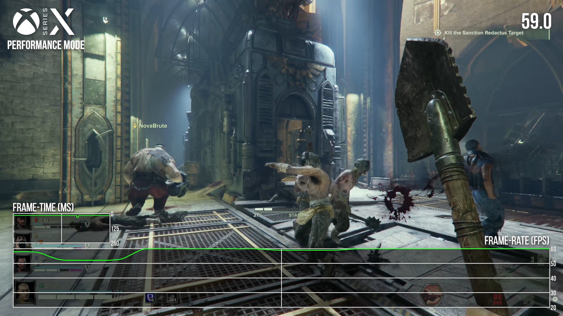 The Series X also packs a performance mode, of course. This option aims for 60fps, but often falls short. Extended frame-rate dips are common, and harsh stutters pop up from time to time as well. In general play it's usually reasonably close to 60fps or at 60fps in our metrics, but the overall frame-rate fluidity isn't as good as it should be. Still, this would be my preferred way to play the game at the moment, as Darktide just feels a lot better with a faster cadence of frames, even if there are still some inconsistencies and obvious frame-time stutters.
