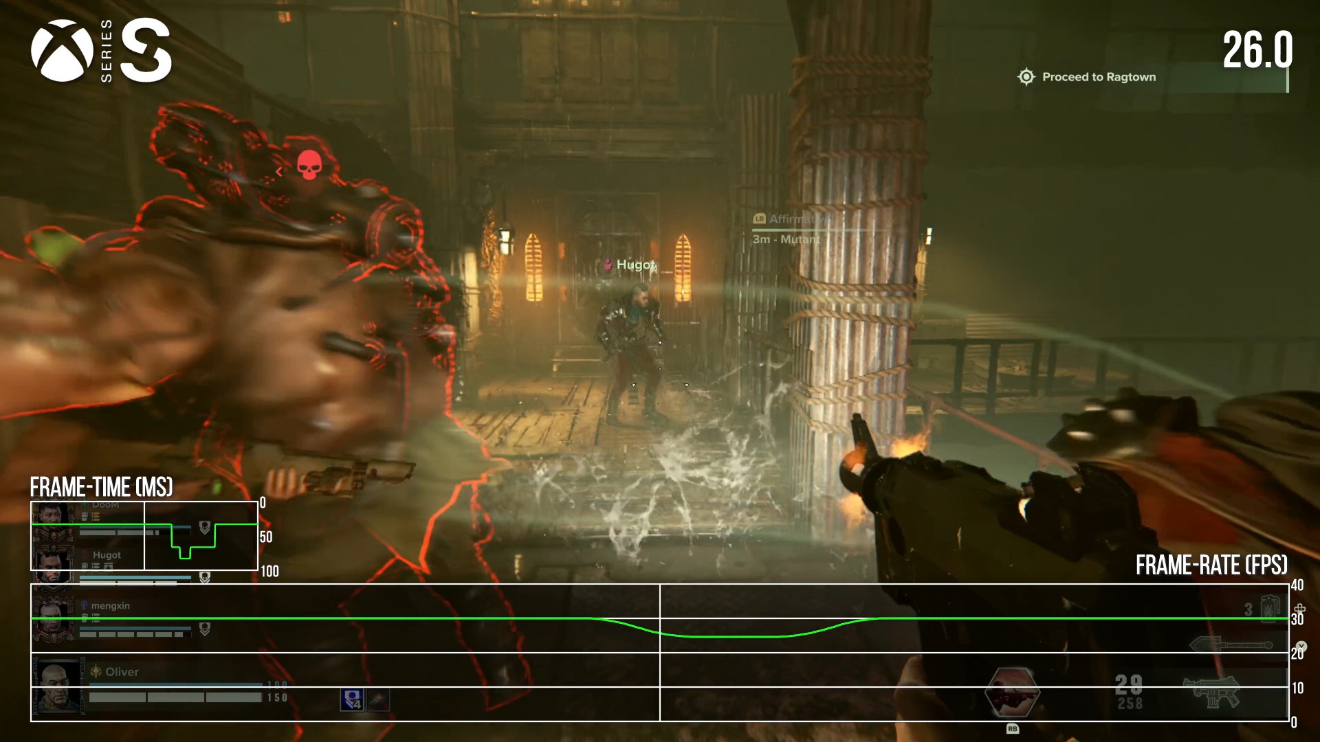 Performance in Darktide is, unfortunately, a bit of a mixed bag on consoles. In the Series X quality mode, Darktide runs at a pretty consistent 30fps, even in intense firefights. However, the title suffers from occasional hitching, compromising the experience with a barrage of high-latency frames. Outside of these moments, you do get a decent enough 30fps update, though motion blur would stand to improve from a lengthened shutter speed, which would make the game feel a lot more fluid in motion. Series S follows a similar pattern. Microsoft's junior console hits and holds a stable 30fps, punctuated occasionally by frame-time stumbles. It's about the same as the more powerful console in general play, with the same somewhat unstable feel.