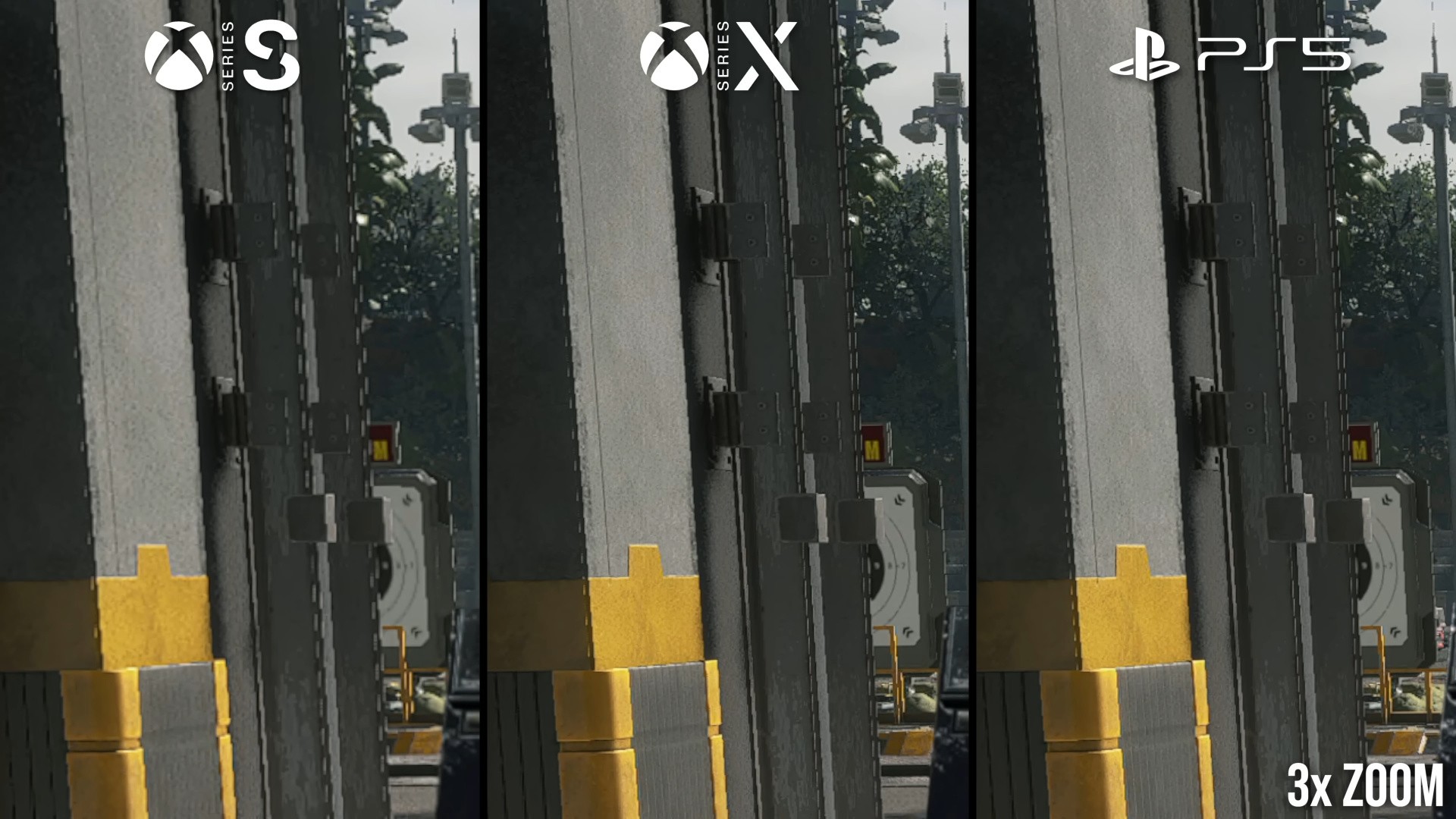 Image reconstruction is used on each platform, specifically checkerboard rendering, but these artefacts are largely hidden by the game's fairly strong motion blur (which can't be disabled). There's also an odd-looking static grain that is visible against certain structures and also shows up prominently in the edges of shadows. It's definitely a visual annoyance, though it's more obvious close-up on a monitor than it is on a large format TV.