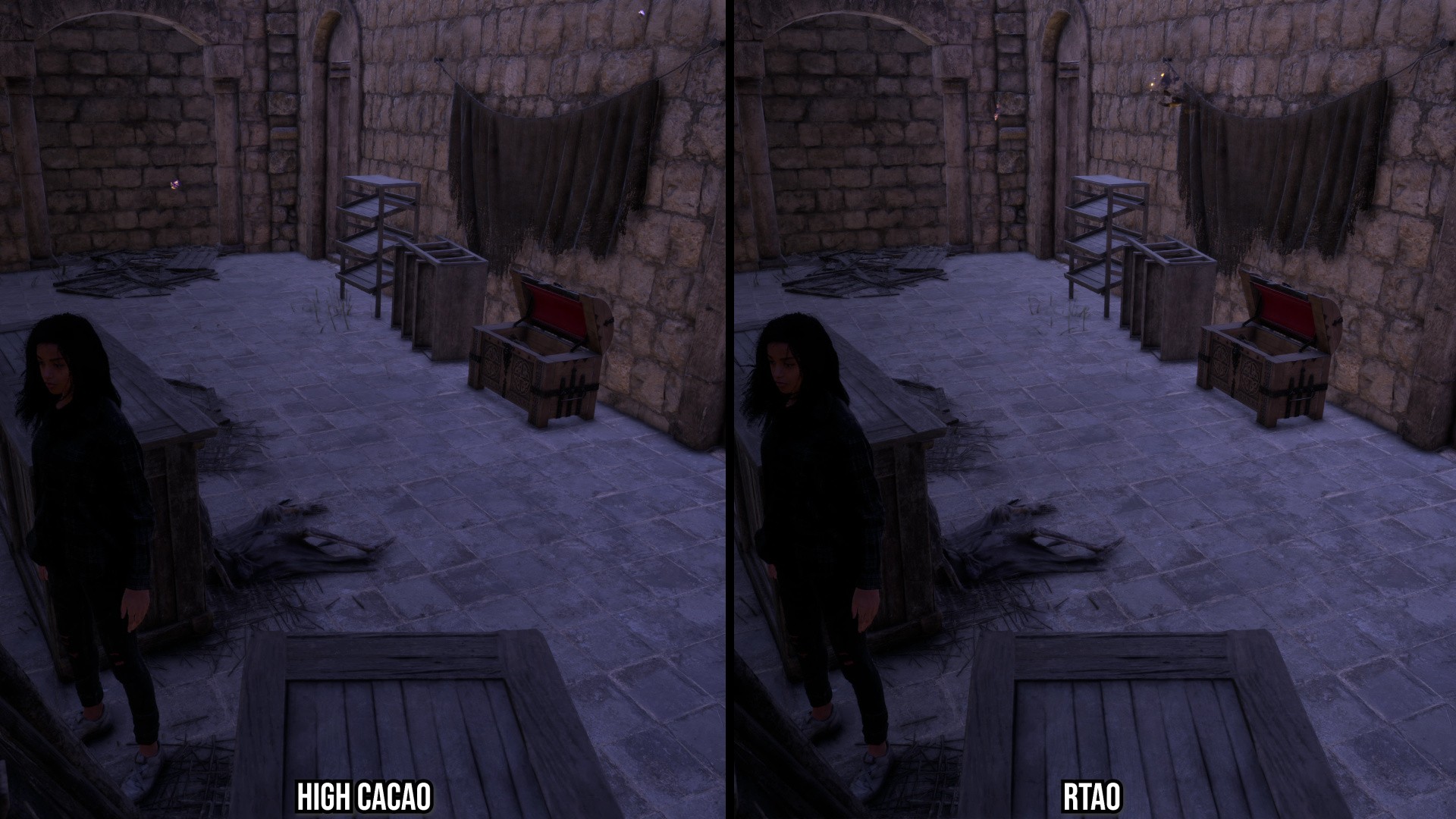 This brings us to Forspoken’s two ray tracing options, shadows and ambient occlusion (RTAO). To be honest, these are the most lacklustre RT options in a AAA title to date. RT shadows, for example, don’t apply to many objects, such as grass or larger foliage, character hair and even some characters; instead you just get a bare minimum implementation that helps out small opaque details close to the camera and some nice softening for distant shadows. Enabling RT shadows drops performance by around 20 percent on RTX 4090, and for mid-range or lower GPUs the cost of the BVH structure in video memory is enough to make it extremely hard to recommend.