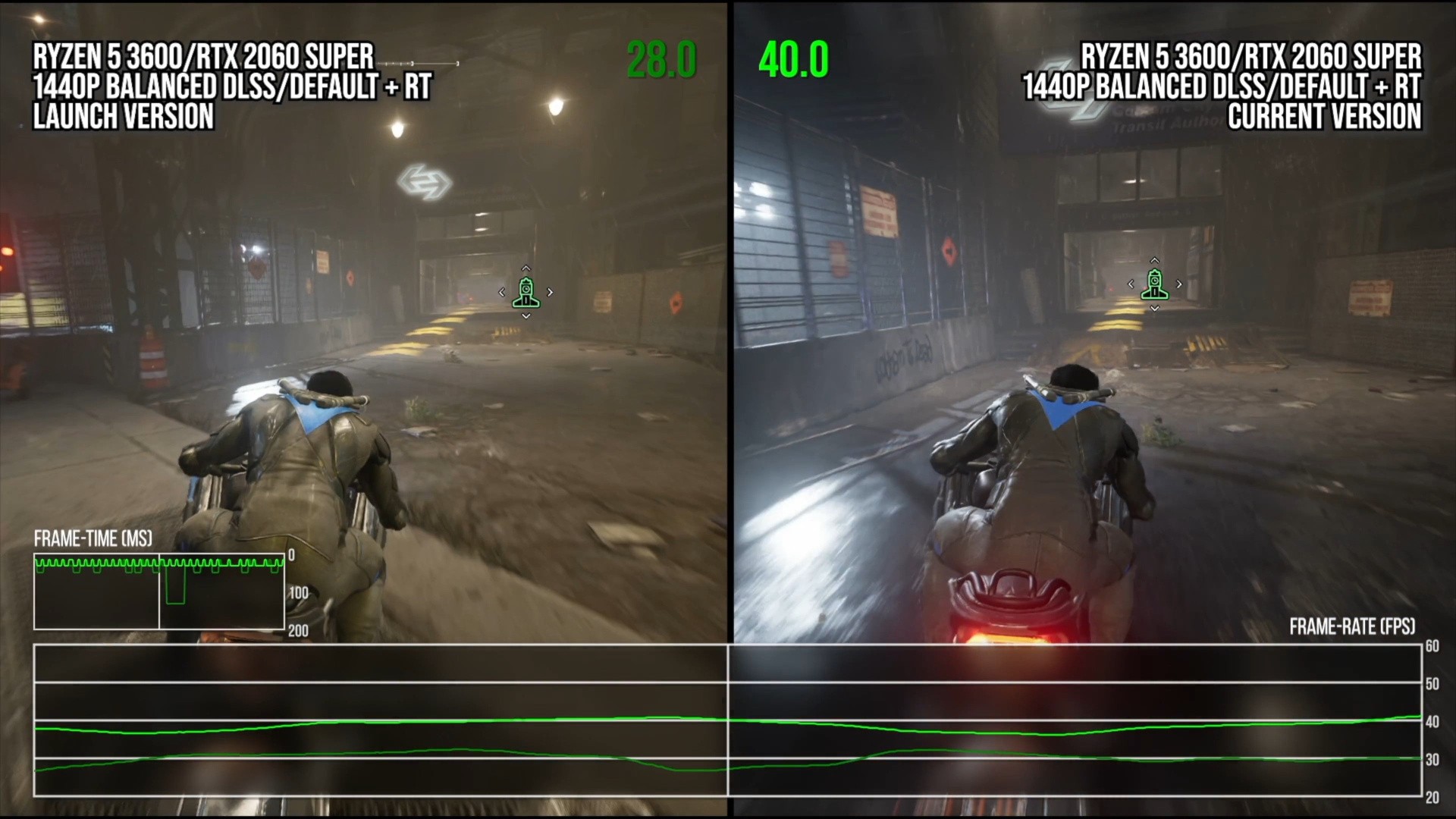 Open-world traversal, where the launch release suffered most, is also very stable. Long stretches run at a perfect 30fps, even when speeding through Gotham City on the Batcycle. I can't say it's completely perfect - one-off dropped frames can pop up, though not more often than every few minutes or so. For all practical purposes, open world gameplay just hugs that 30fps update. The opening bike chase, which is possibly the most consistently demanding scene in the entire game, provides a helpful illustration. The updated PS5 code is almost a flat line here, with just a handful of dropped frames through the entire sequence, while the launch version goes on a bit of a frame-time rollercoaster ride. There are extended dips, sharp stutters, and plenty of 16 millisecond frames sprinkled in for good measure on that original code. The new version brings a night-and-day improvement, and is ultimately a much more enjoyable experience.