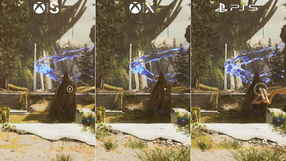 Inevitably though, any movement, especially with fine detail on-screen, produces clear scaling artefacts. We get noise - almost like a fizzling effect. Curiously it's also noted that PS5 resolves with a sharper image overall, despite sharing the same base resolution with Series X - a point that possibly suggests a different post-processing treatment between the two. Even more notable is the state of Xbox Series S. Again this version targets 60fps - and resorts to FSR 2 scaling to get there. The base resolution here though comes in at around 768x436, resulting in a much blurrier image, and even more pixel breakup than the other two machines.