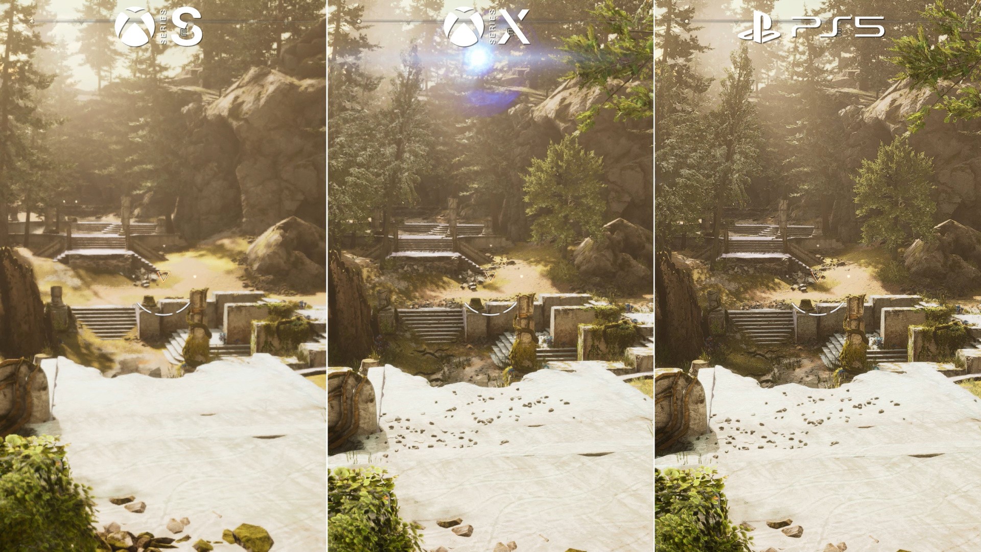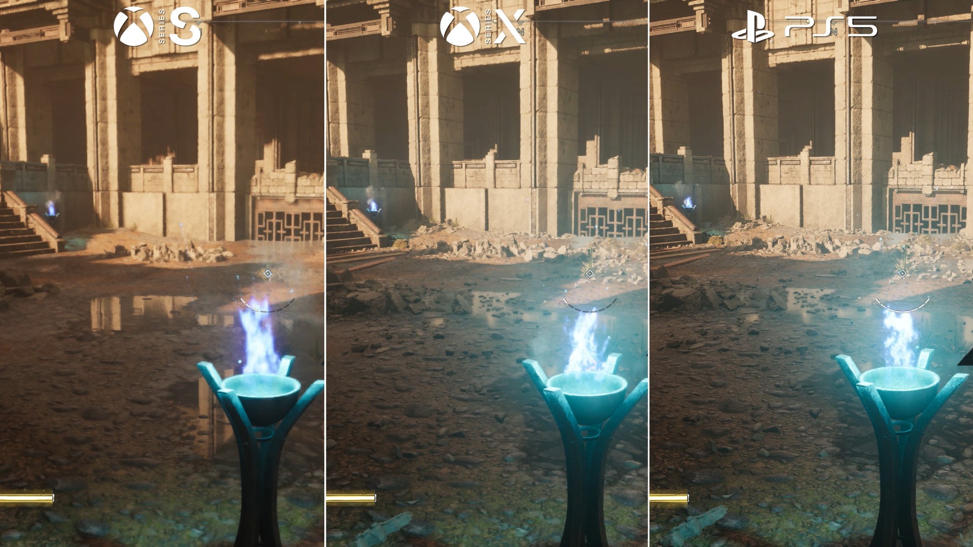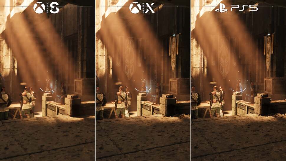 If we focus just on the Xbox machines, almost every aspect of Immortals' visual design is dropped a setting for the 4TF machine. First up there's world detail. In the ruins area of chapter three, grass, rocks and entire trees are stripped out from the scene. Sometimes the contrast is huge. Series S pushes for 60fps - but to get there has involved a big hit, leaving it with much more barren-looking environments. Another example is in the garrison area near the city: the wood planks on the floor, the flags around its alleyways are all removed. You'll also see geometry, shadow, and object LOD settings are drawn back on Series S - resulting in more pop-in overall.