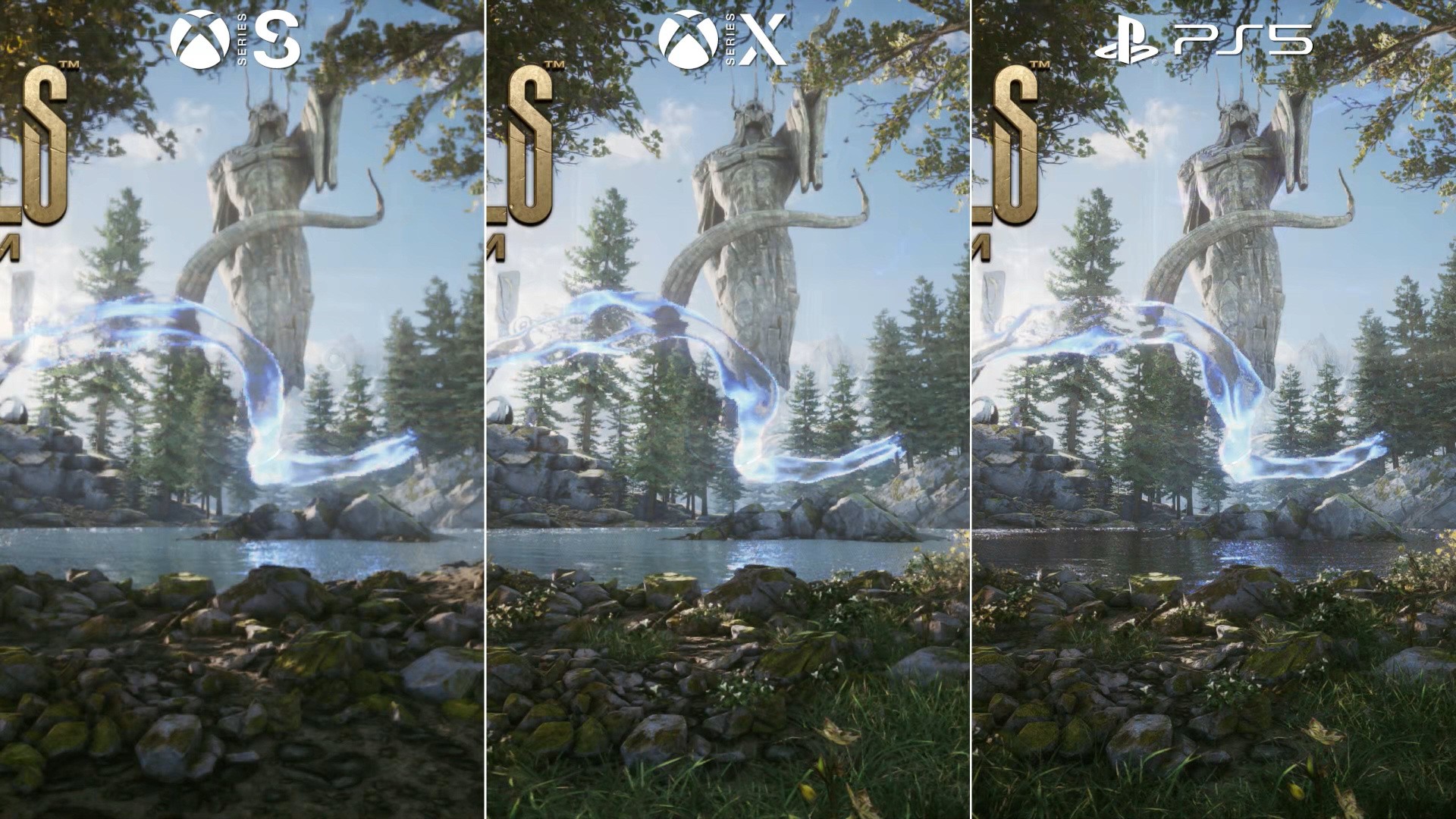 All of this leverages Unreal Engine's 5's Niagara system to manipulate the same effect asset for different results. At peak action, the spells themselves are impressive, and it's a clear mark of a true current-gen title that it's all possible with 60fps in mind. The only odd point I've noticed is how god rays render at a low resolution on PS5, Series X and especially Series S. Certain effects also update at just 30fps - half refresh, which stands out when gameplay runs at 60.