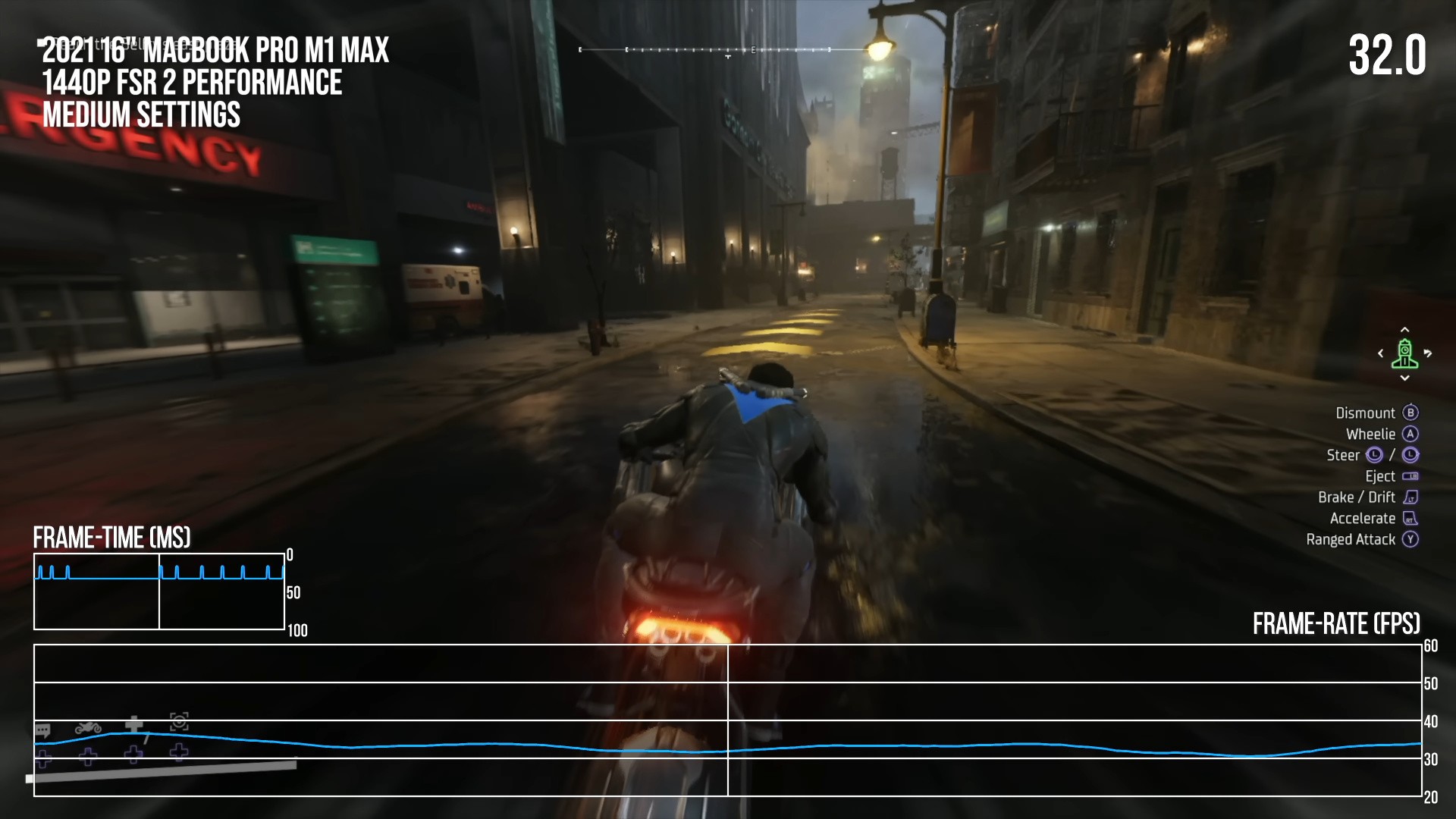 On the positive side, the game graphics continue to render without issue, and I had no issues whatsoever hopping in and playing just like I would on a gaming PC. Unfortunately, we're typically in 30-60fps territory again, though this is less unexpected than with Dead Space. Gotham Knights exhibits a poor CPU performance profile during open world traversal, bound by single-core speed, so the M1 Max's cores being capped at 3.2GHz is probably limiting our performance. On the flip side, indoor scenes hold a stable 60fps and the game is quite playable overall, despite the two-faced performance profile - especially bearing in mind that mid-range and low-end PCs face similar issues.