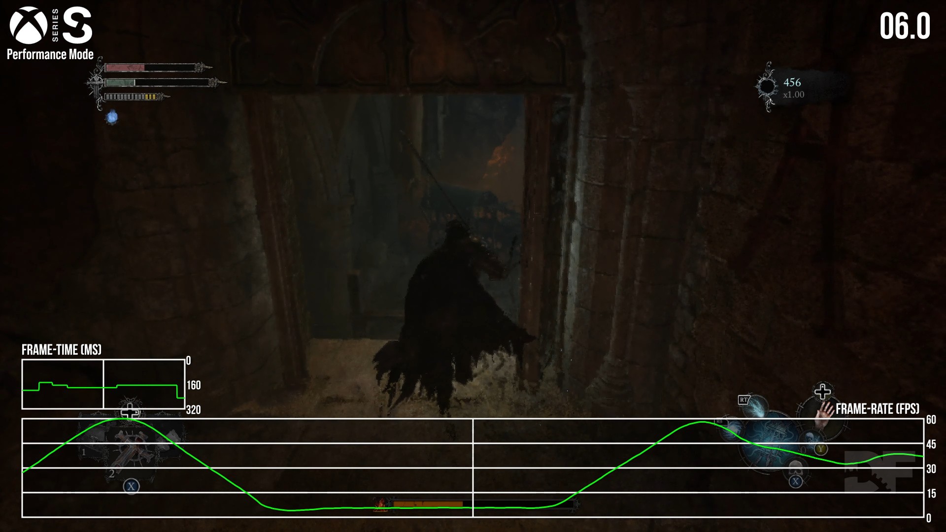 All of this appllies as of the latest update, 1.1.293, where these performance hang-ups are still a problem. After giving the Series S machine a complete reboot, and setting up a brand-new character it's not long before performance crashes to the single frame-rate digits. Playing for barely half an hour, I spotted a heavy lurch down to 5fps for a good stretch, just before the Pieta boss battle. More crucially though, the frame-time reading shows stutters in excess of 320ms - making the game near impossible to control for seconds at a time. These hang-ups are admittedly less common than they were at launch, but it happens often enough to be a major playability issue.