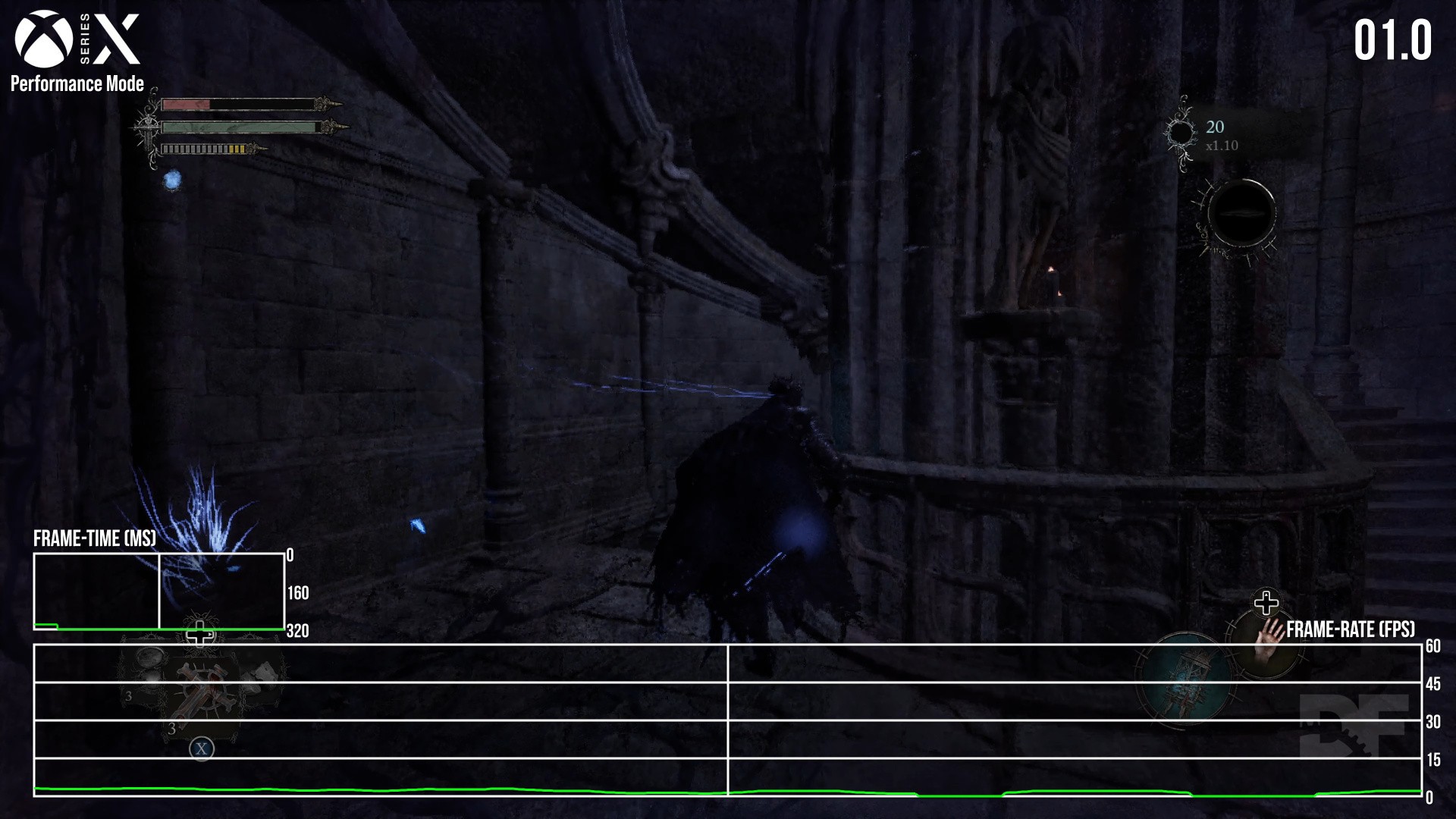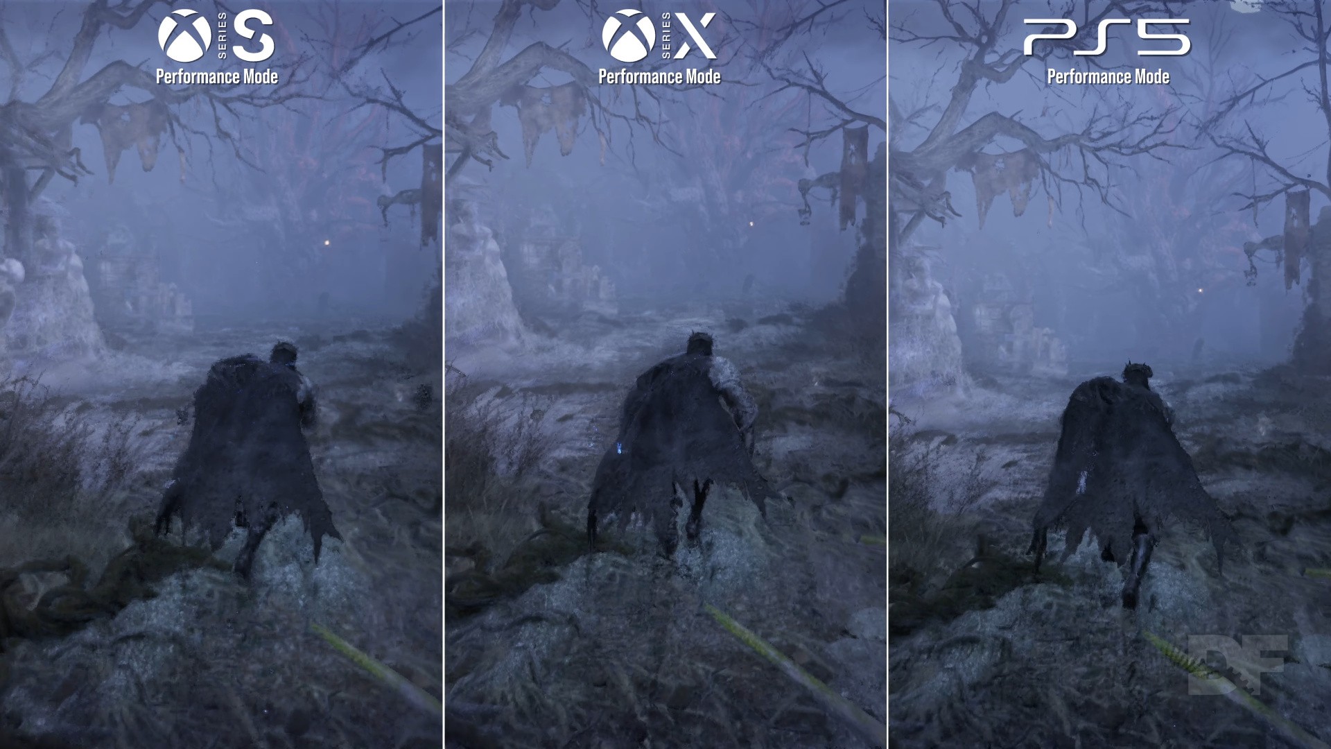 Next along is Series X, which offers some good news to start: in practically every area where Series S drops into the 40s, Series X pushes a more solid 60fps reading. The mandatory tutorial bit, and the ruined village beyond it, are all typically at 60 - though later stress points like the Pieta boss battle and Skyrest hub pull Series X down to the 40fps region. Again it's rapid movement, plus the additional complex geometry of the Umbral realm, that cues bigger lurches. On average, the typical reading on Series X trends towards 60fps at least - while its performance mode's resolution is a dynamic 1152p, dropping to 648p lowest in GPU-taxing areas. Higher resolutions are possible too - and we saw one 1215p sample when looking at the sky - but this is the most typical range.