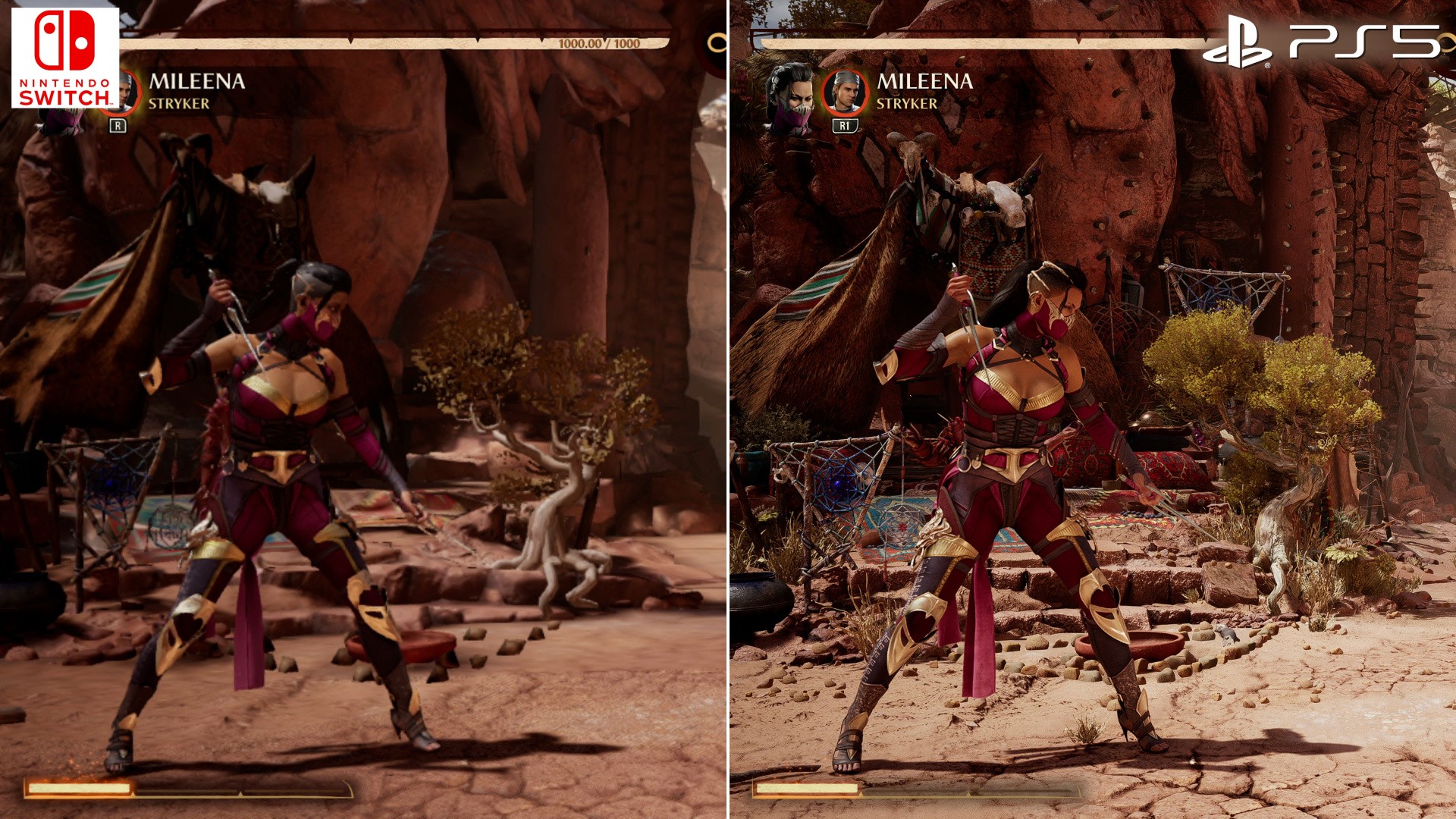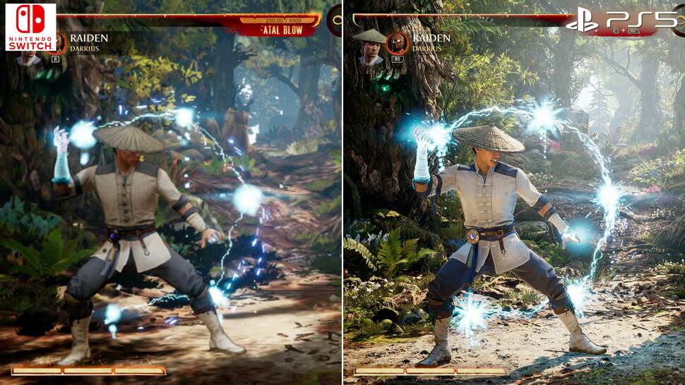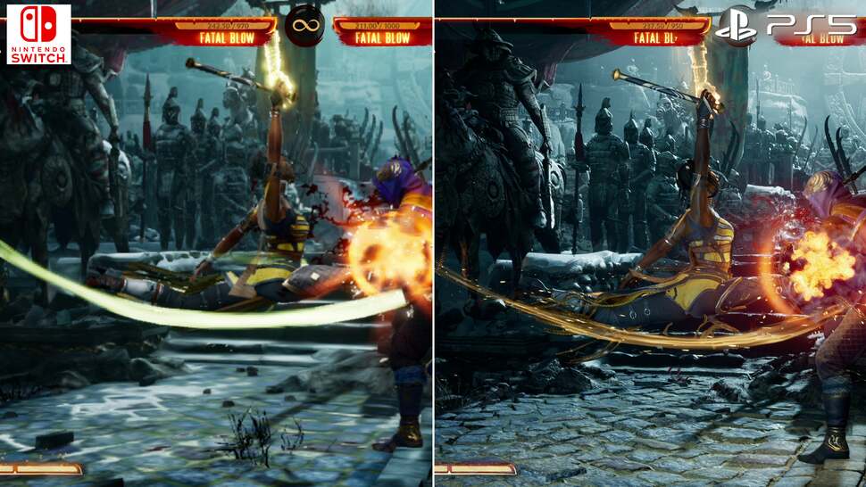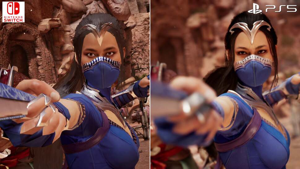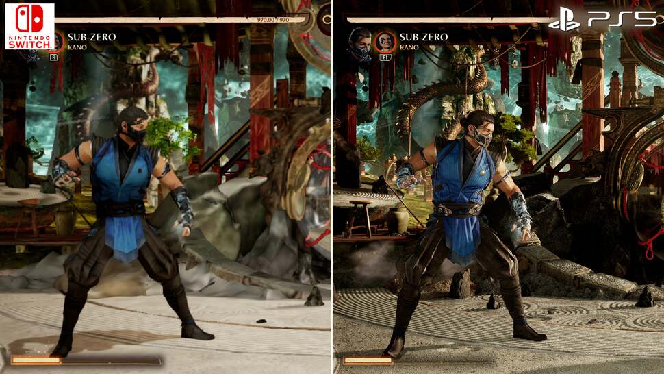 Then there are the visual downgrades to consider. Pitting Switch against PS5 for example, the first point is the drop in native resolution. Docked play on Switch runs at a dynamic 756p - that's 1344x756 max, while the lower bounds come in at 576p during more GPU-intensive stages. Honestly, this is par for course on Switch, and there's obviously no competing with PS5's many-times more powerful GPU, which affords it a dynamic 4K setup, scaling down to around 1800p. Interestingly, Switch runs at its peak 756p in intros and fatalities, where the frame-rate caps at 30fps. And in fairness this is also a higher resolution range than the 540p to 720p we had in Mortal Kombat 11 on Switch. Compared to PS5, the downgrade is obvious but relative to most Switch games, this what we'd expect for it to stand even a remote chance of targeting 60fps gameplay. And of course, portable play drops that resolution range even more so, down to a dynamic 720p, while its lower bounds come in at 704x396. The good news there, at least, is that Switch's smaller screen helps disguise the lower pixel count.