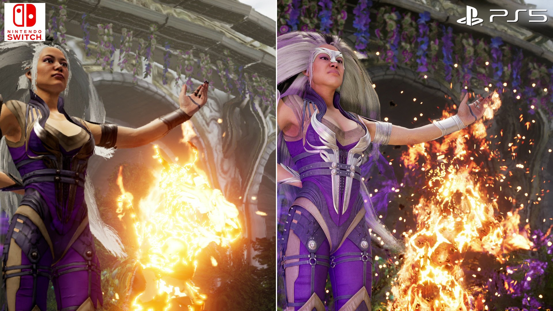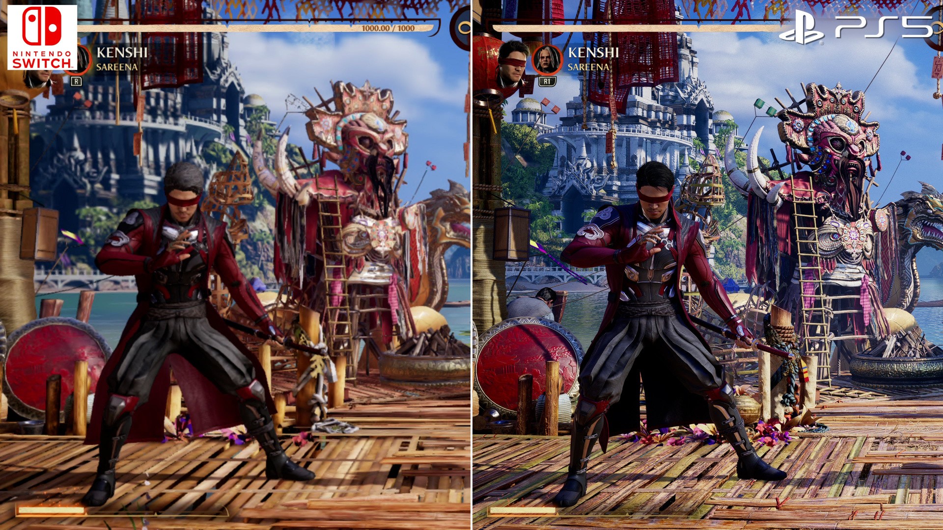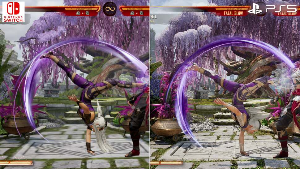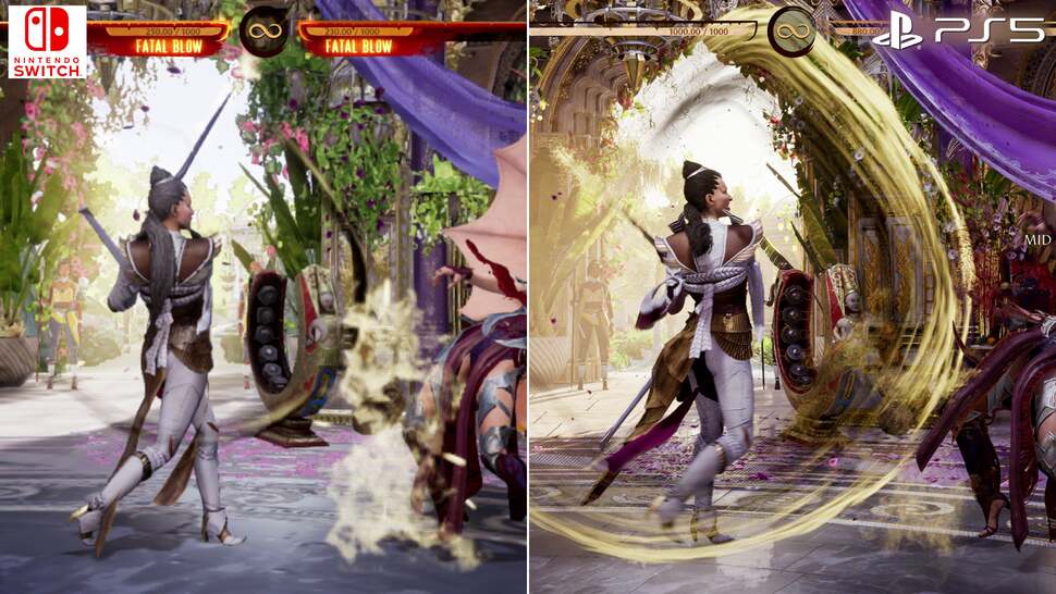 Resolutions aside then, the drop in visual settings across the board are impossible to ignore. In fact, it's easier to describe what hasn't been pruned back from the PS5 version. Every facet of Switch's visual make-up is touched upon: there are lower grade textures, while texture filtering takes a hit. The polygon count on models, plus the geometry in the background, are visibly dropped in complexity. Foliage is stripped out, or otherwise lowered to a simplified plant or tree model. Effects are removed, or culled in resolution - often dulling the impact of special moves. Screen-space reflections are axed from the Switch release across the floors. All round the result is still recognisable. In still shots it's essentially a mobile version of the game, and it's impressive how deep visual trade-offs go. You'll notice the lighting model is altered too, and so, shadows are stripped out from the background, while character shadows appear at a different angle on Switch. But then, on specific stages like the Hanging Gardens, shadows are even entirely removed from characters during fights.
