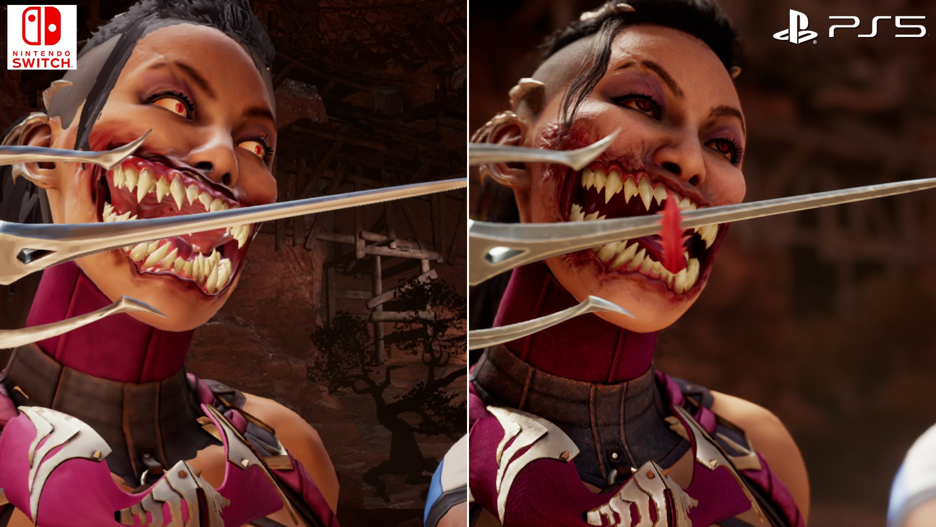 Cutscenes are also problematic on Switch. Motion capture on PS5, Series X, S and PC is expertly delivered by Netherrealm Studios as always. Sadly though, facial capture details do not translate well to Nintendo's handheld -and has been the source of many memes since its release. Full body motion capture is intact, but the most glaring issues relate to missing character mouth and eye animations. They're static at points, creating uncanny moments during in-engine intros. Worse still, there are numerous visual bugs during intros, an fatalities, that spoil the experience too - including collision issues on characters as their teeth don't sync with the movement of their mouths. Likewise, even the story mode has clear issues, with flickering shadows across characters, right from the first bout of fights. Plus, there are stretches of tearing and hitching during the pre-rendered scenes on Switch, which is likely a CPU contention issue as Switch loads the next stage behind the scenes.