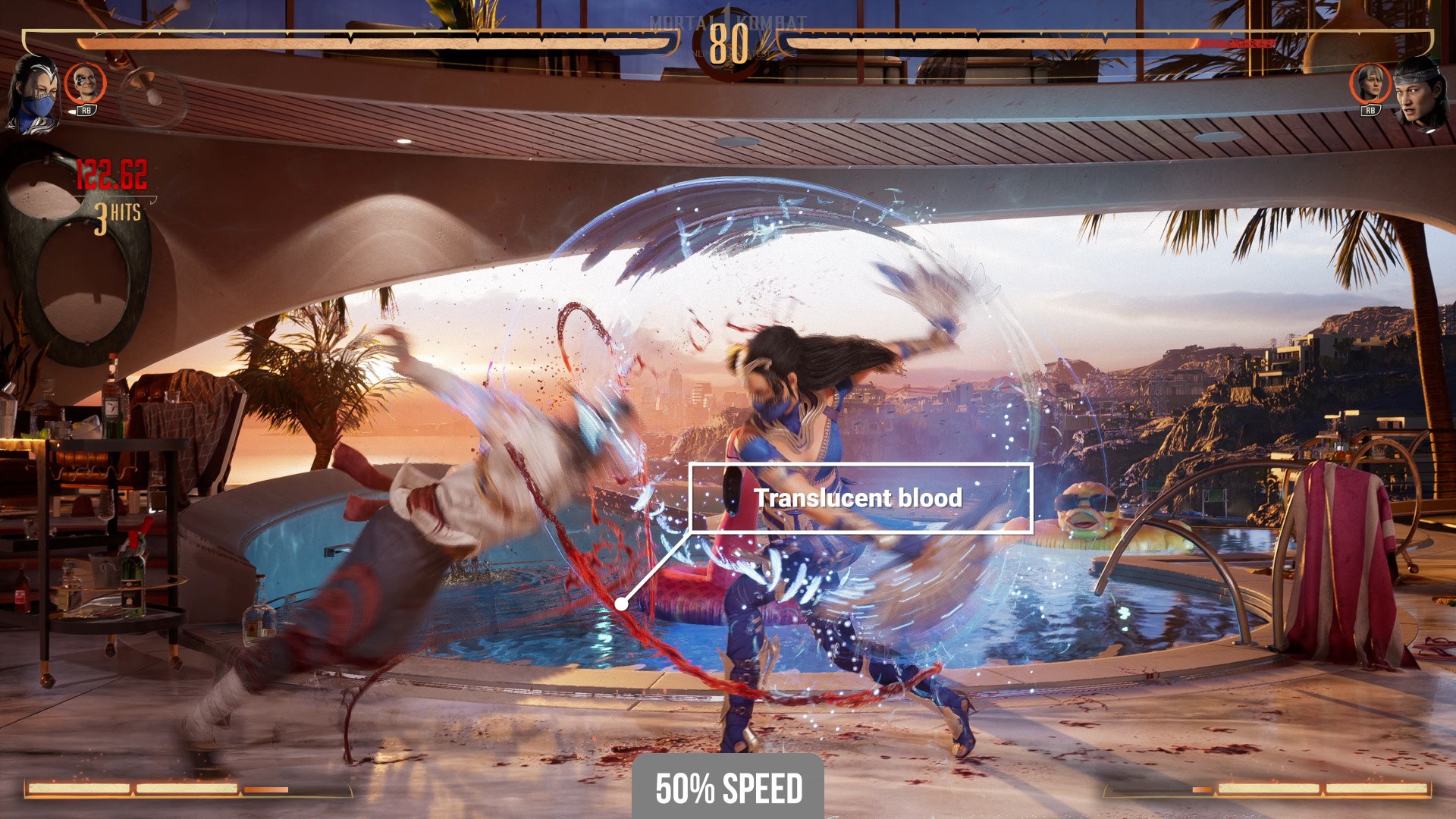 In terms of animation, this game still feels very true to the style of Mortal Kombat, with the per-pixel character motion blur we saw in MK11. It's subtle, so it doesn't blur the action, but it does look great. The backgrounds are also shaping up to be impressive, with well-crafted materials, subtle shadowing and proper reflections, backed up with realistic physics that let you knock over smaller items. There's a ton of small detail throughout that really elevates the overall presentation.