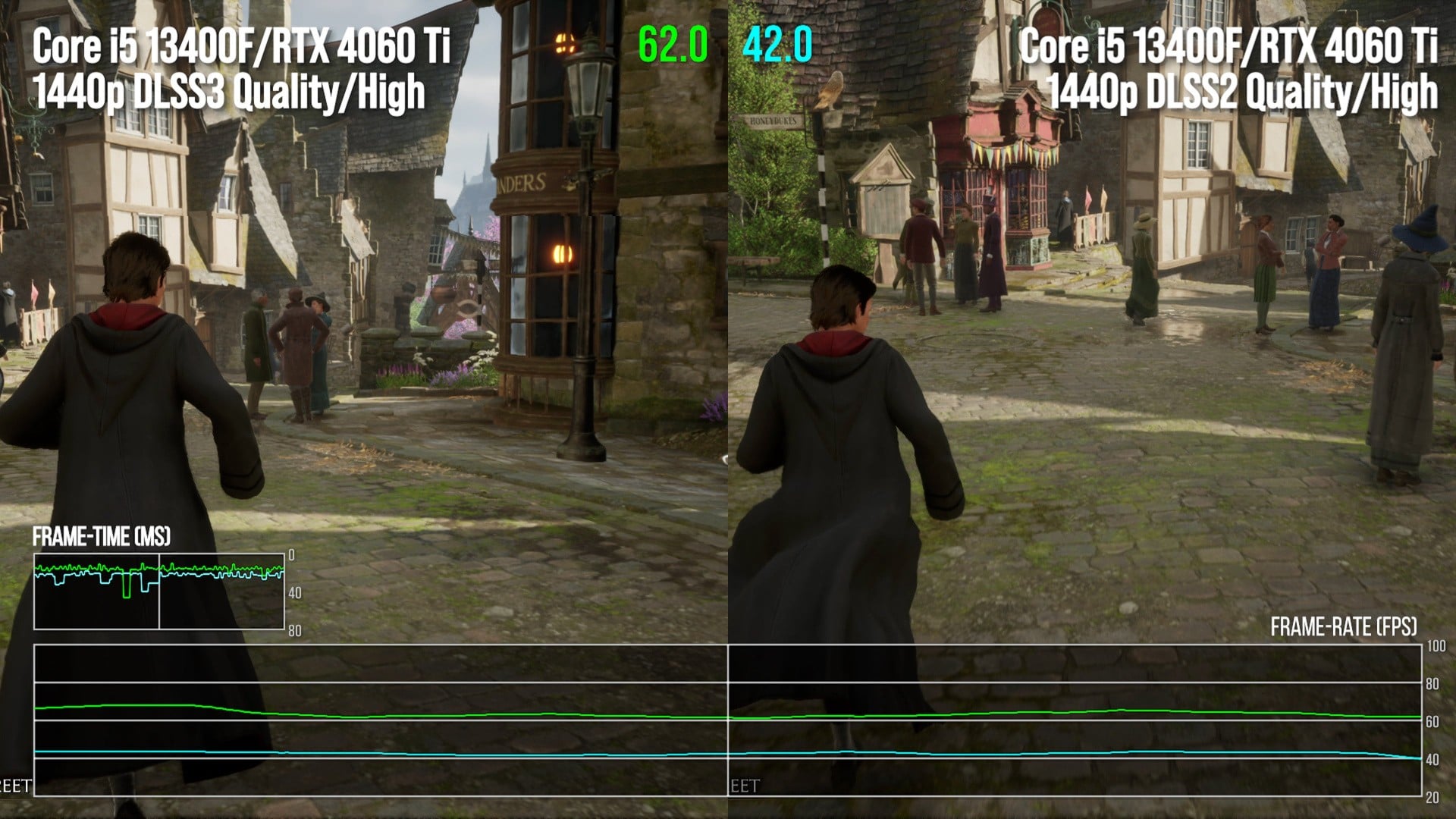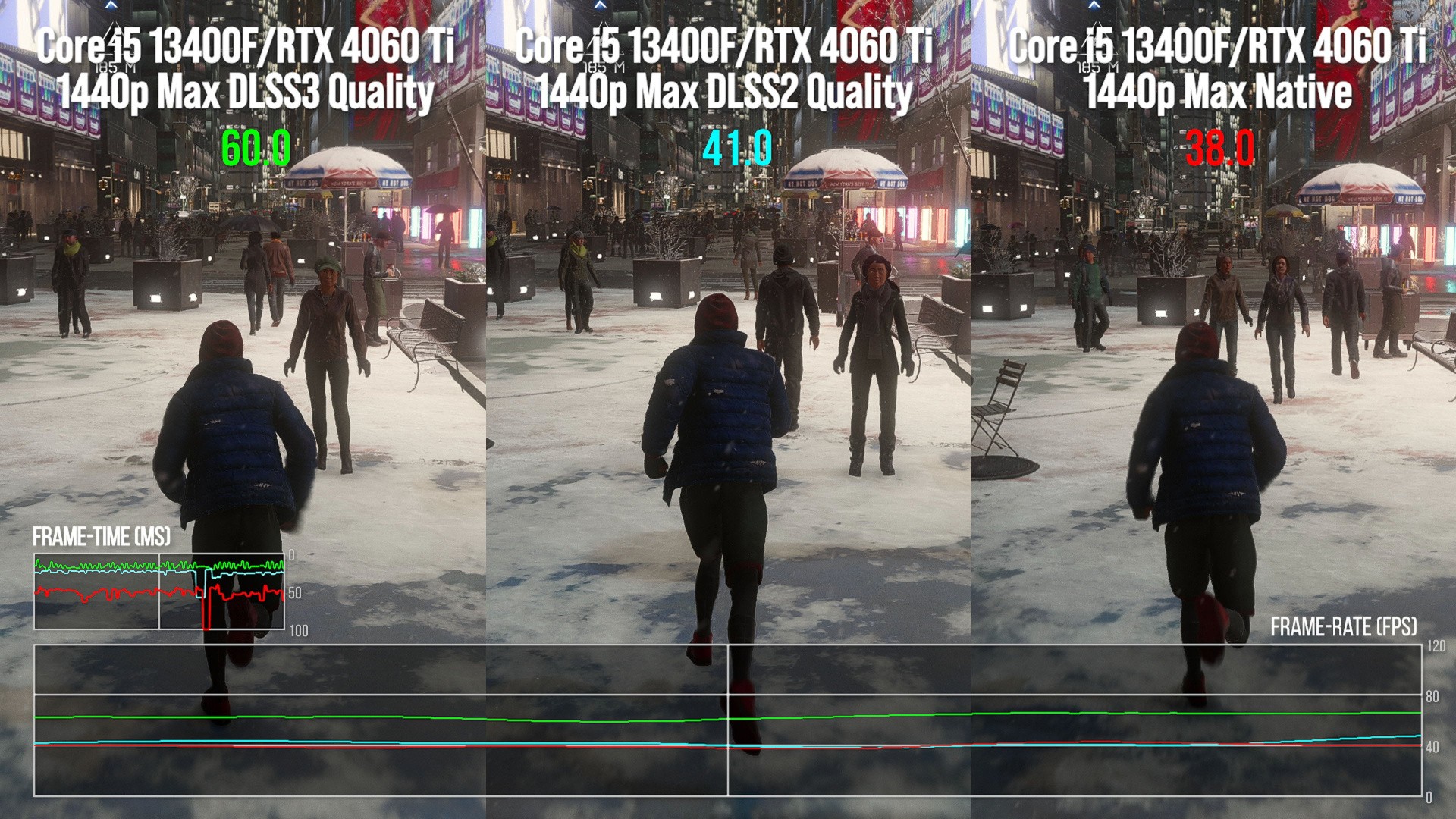 I also paired the RTX 4060 Ti with a mainstream PC using a Core i5 13400F and 3600MT/s DDR4 and found that DLSS 3 has a more valuable role to play than you might imagine. So many recent games are CPU-limited if you want to tap into the full power of your GPU. Even an RTX 4060 Ti paired with the 13400F produces lop-sided results - 1440p DLSS balanced on ultra is perfectly viable in A Plague Tale, but you're horrendously CPU-limited in busy areas. DLSS makes the whole thing a lot smoother. Similar results were observed with Hogwarts Legacy on high and Marvel's Spider-Man: Miles Morales as you can see from the snapshots below.