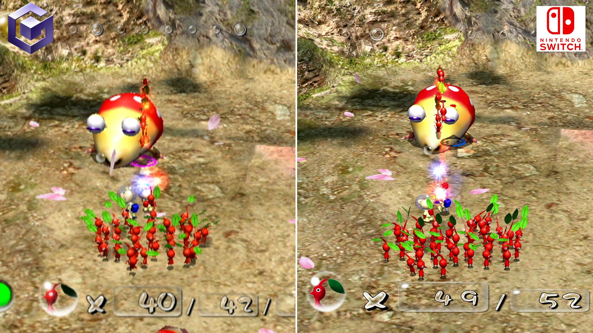 The Switch version gets off to a great start by boosting the resolution, but of course, running either game in portable mode means they render at 720p instead, which is still fine as a 1:1 pixel match for the display. The only downside is that there's no anti-aliasing applied whatsoever to the image in either docked or portable modes. Expect some rough edges and some pixel shimmer, though it's a decent, crisp looking image overall. It's also encouraging to see the font, the UI in menus and gameplay are also upgraded in concert with the res boost on Switch. These elements were beautifully designed on GameCube, but the original 2D assets just wouldn't have held up to scrutiny today, left as is. As it's such a crucial way to track the gameplay in terms of the number of Pikmin and the time left in a day, Nintendo's made the right call in bringing the UI up to standard.