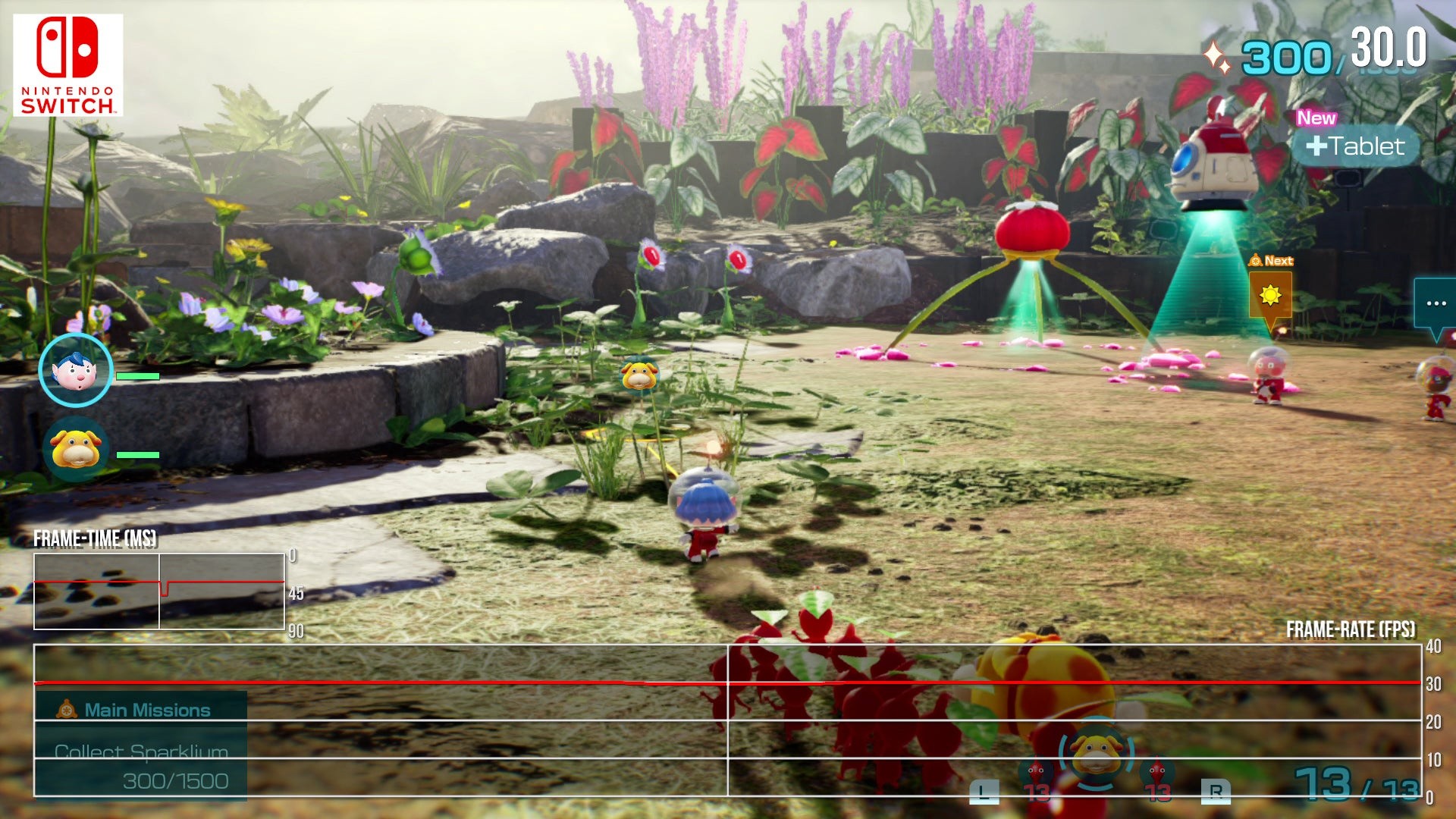 Last up is performance, and thankfully we can report that the game runs at a locked 30fps throughout whether you're playing in docked or portable modes. There are minor single-frame dips as you pan the camera quickly around the garden, but these drops are likely to coincide with dynamic resolution adjustments. On the whole, it's not too intrusive, though it's a slight step back from the watertight 30fps lock we see in the other Pikmin games. As an aside here, Pikmin 4 also drops at points momentarily where transparent elements fill the screen. Otherwise? This is an absolutely rock-solid experience at that 30fps line.