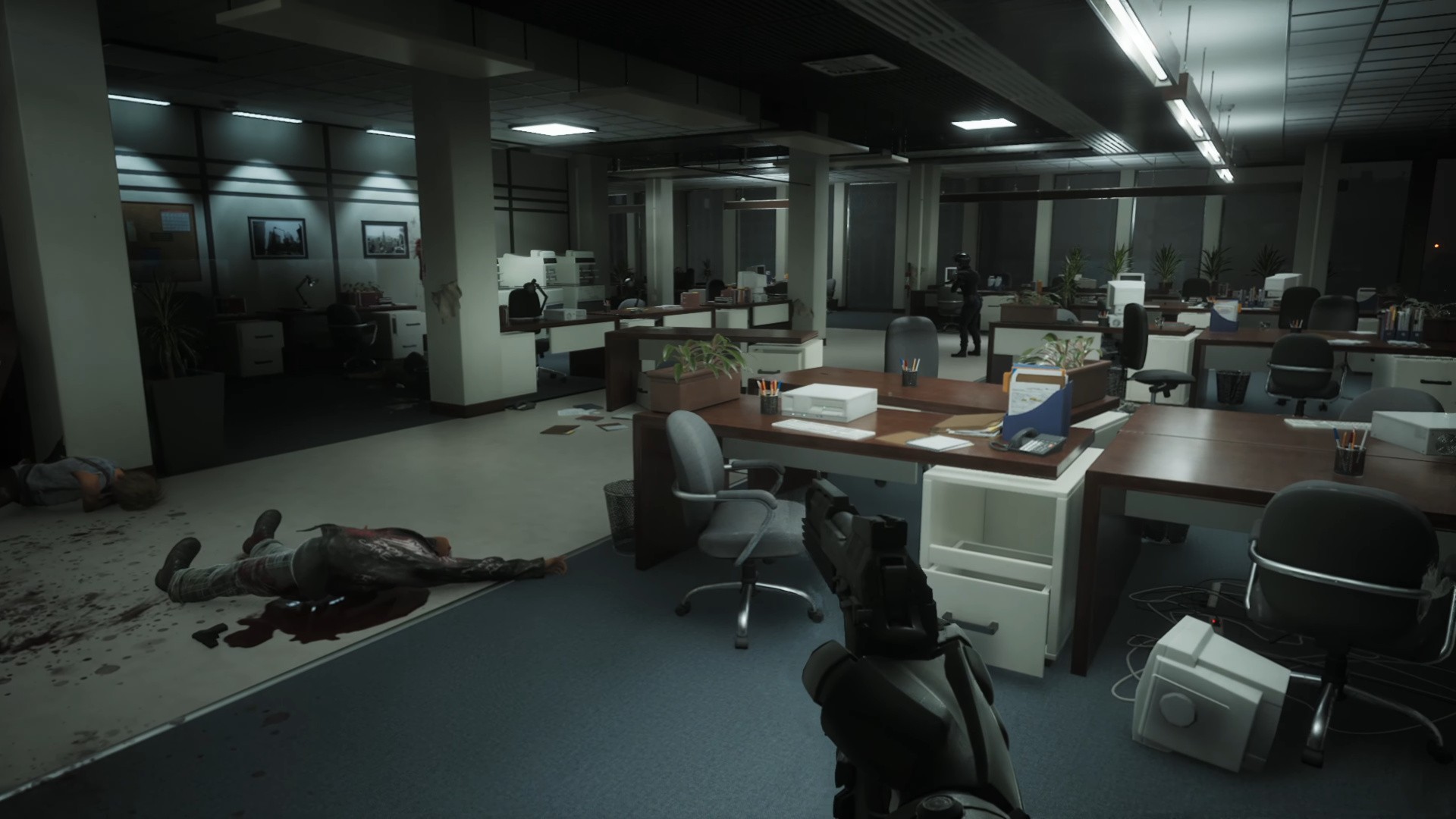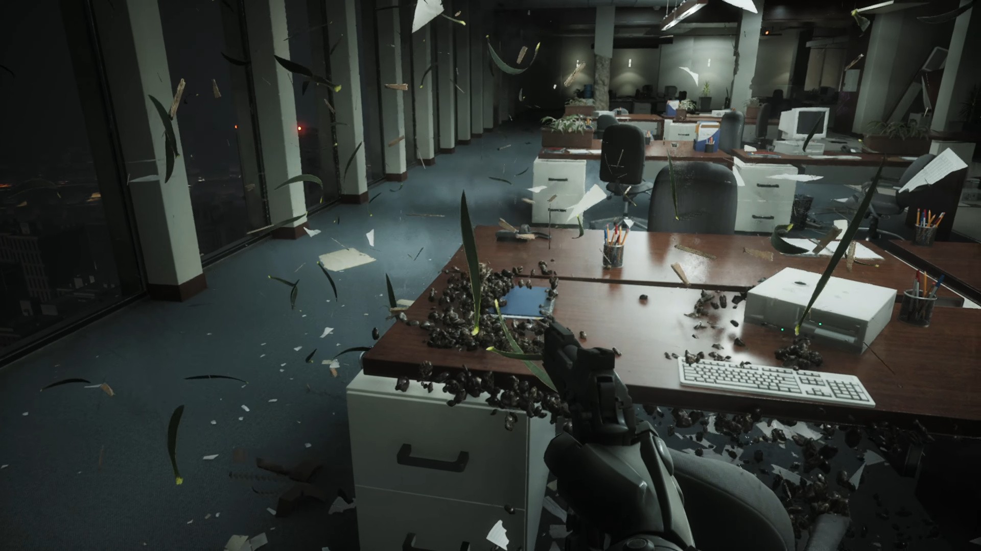 That's not to short-sell RoboCop's unique visual touches, though. I loved the level of cosmetic destruction, for instance, with pillars sustaining chip damage, glass exploding, and papers scattering. Planters are particularly inspired - they explode into hundreds of geometric dirt chunks when shot. Enemies shoot out spurts of blood when you hit them, like squibs in an 80s action movie, and project viscera onto walls when killed. In motion, the game is a ballet of destruction, with environments and enemies alike demonstrating the violence of RoboCop's weaponry.