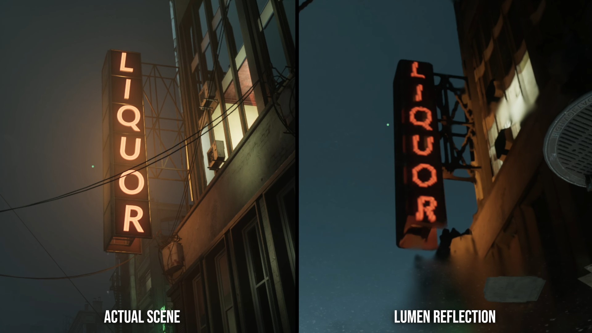 That said, if you do look closely, Lumen reflections aren't perfect. Geometry has a crudely averaged appearance in the distance fields used for tracing, so if you look closely in a glossy reflection, the details can look a bit off. Skinned meshes - like the pedestrians here - are only represented in screen-space, and don't appear in the reflections if we tilt the camera down. Semi-gloss reflections can also exhibit slightly questionable quality, with excessive noise.