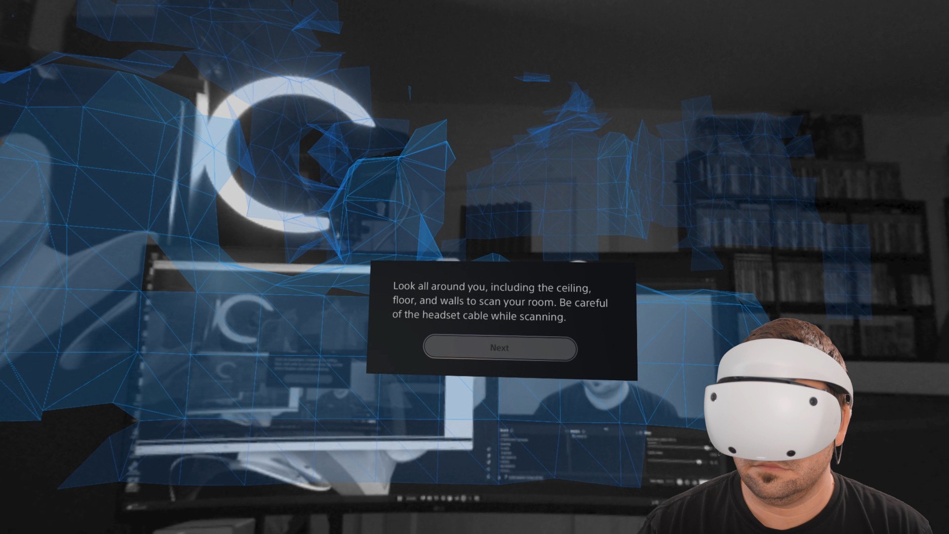 Once the headset is firmly in place, you're presented with a series of setup steps - unlike PSVR1, this new headset does not rely on external tracking so no camera or sensors are required. To determine the size and shape of your place space, the headset scans your environment as you look around, creating a blue polygonal mesh representing the available area. It feels magical and can be tweaked after the fact, if you wish, by simply pointing your controllers and dragging the edges outwardAC. You can even assign temporary spaces if you move the headset around. It's comparable to the guardian setup with Oculus products but feels even more refined.