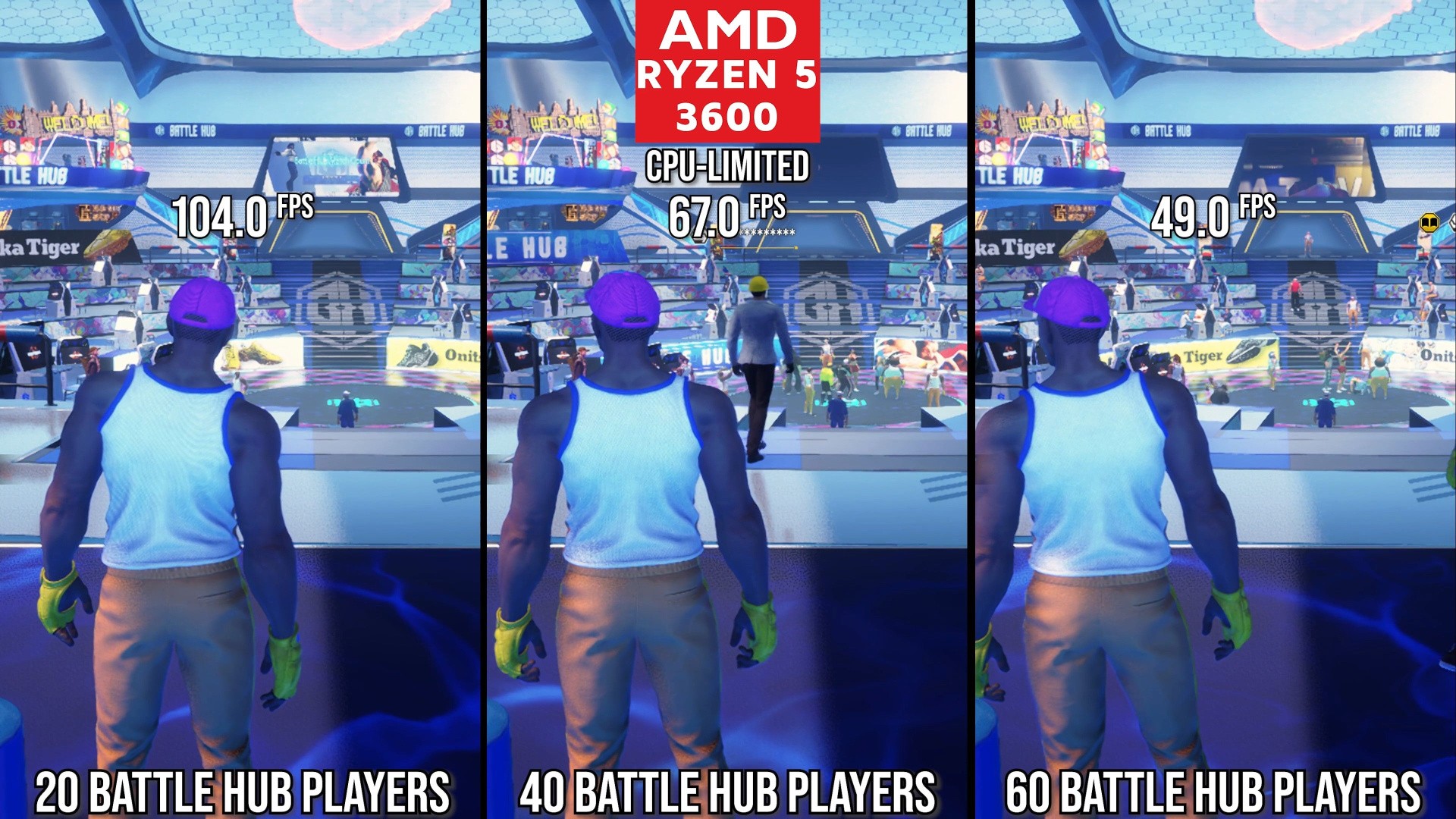 CPU-related settings are a different story as they can have a large effect in the world tour or battle hub areas. In the battle hub just running around with maxed settings, CPUs are thrashed by the amount of potential animated players loaded into the area - the load balance across cores is OK, but at times, it is easy to see how one thread is getting a lot more use than the others. With that behaviour, a Ryzen 5 3600 finds itself well below 60fps with poor frame-times at the 60 player max setting.