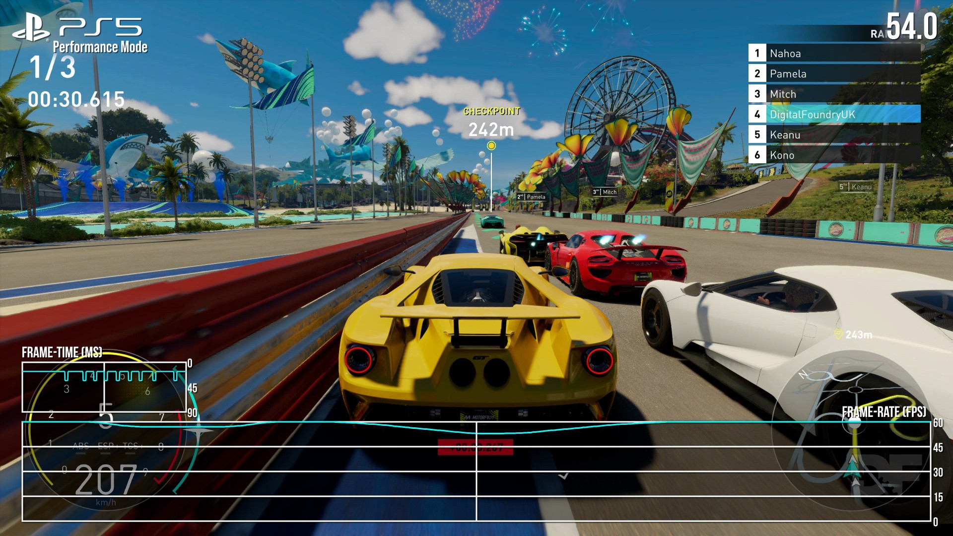 Kicking off with frame-rate testing, PS5 in its performance mode delivers 60fps with v-sync engaged most of the time. It's certainly not a perfect reading, with some races dropping briefly to the mid-50s - often triggered by too many cars in one spot. The starting grid is at times a stress point, though splitting from the pack tends to even the frame-rate out again. On balance, it's never too glaring, and it's still an enjoyable 60fps experience 99 percent of the time.