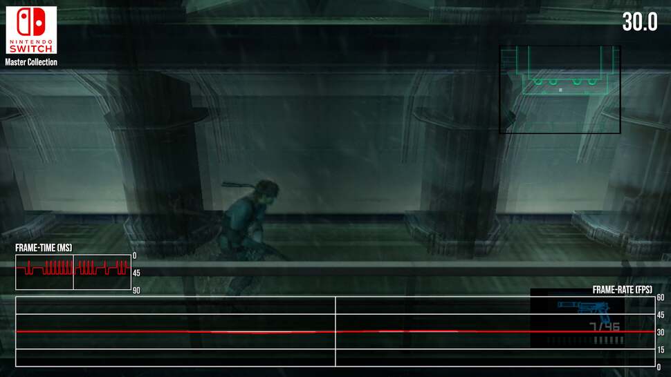 For Switch and its Tegra X1 chipset, there's clearly a bottleneck to getting either game running at 60fps, but the problems don't end there. Sadly the 30fps cap isn't even well-implemented with uneven frame pacing, creating juddery movement and drops below 30fps. Typically MGS2 fares worst, and this game appears to be a lightning rod for the collection's most glaring problems. In MGS2 we get lurches into the low 20s on first meeting Fortune, for example, and 18fps in long shots of the oil rig. Switch just isn't coping here, even at 720p with zero anti-aliasing. Oddly enough, there are flashes of uncapped 60fps gameplay in MGS2 on Switch - in opening lockers or doors - despite the 30fps cap being fixed 99 per cent of the time.