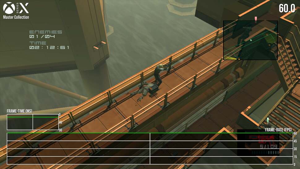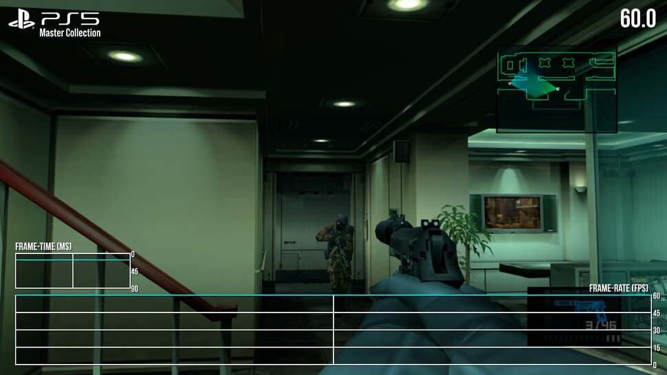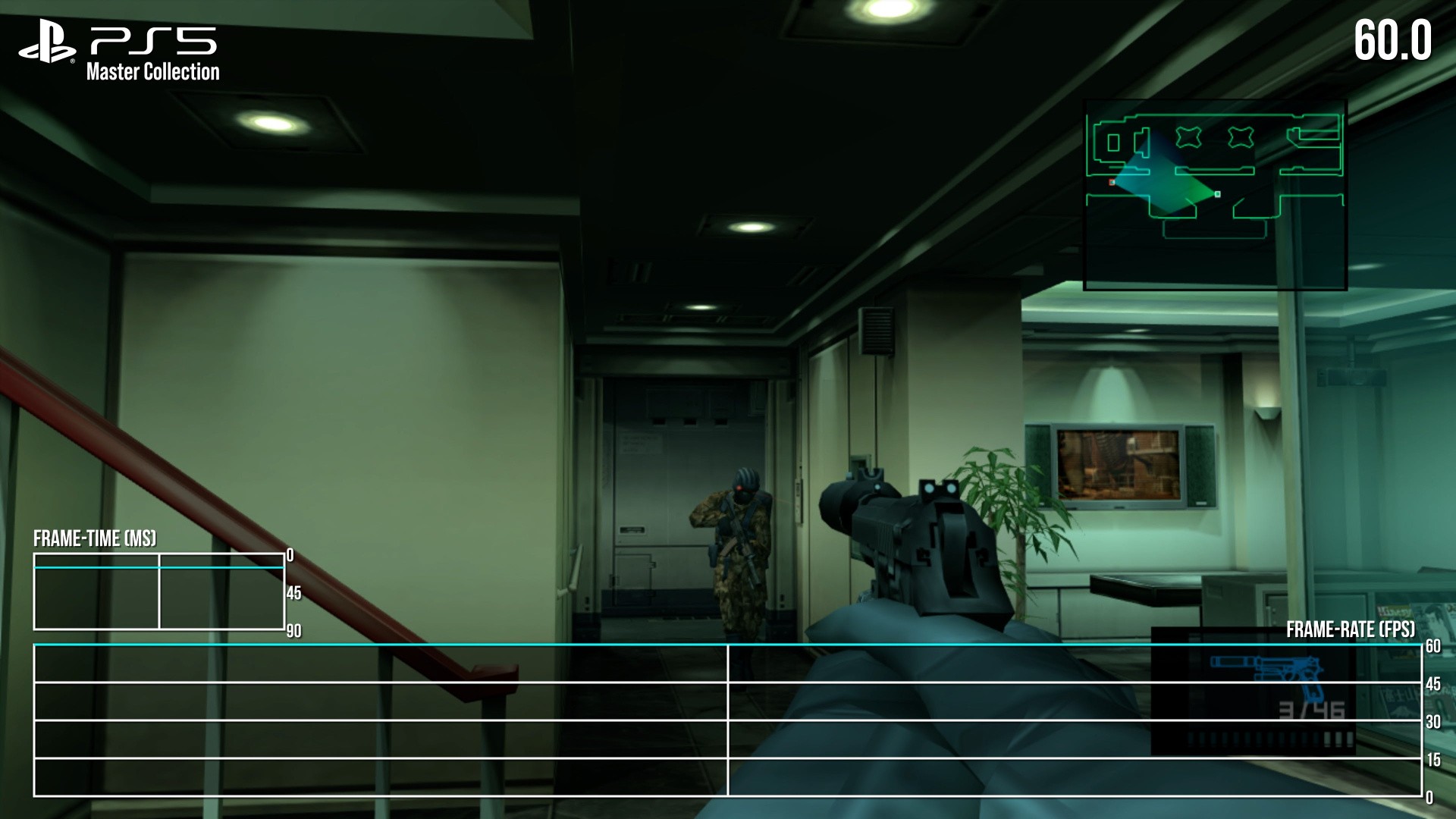 The original Metal Gear Solid in the Master Collection plays it very safe, with no differences playing it between PS5, Series X, Switch or PC due to a straight emulation approach handled by developer M2. As such, many of the quirks of the original PS1 game are preserved: a base resolution of 320x240, and PS1's signature affine texture warping that causes texture maps to 'wobble' as you move the camera. The one upside is that the dithering of the PS1 original is removed for this release, giving us a cleaner image. Hardware clock speeds are simulated too, meaning we get an authentic 30fps cap with hard drops to 20fps and under, normally in the first-person view.