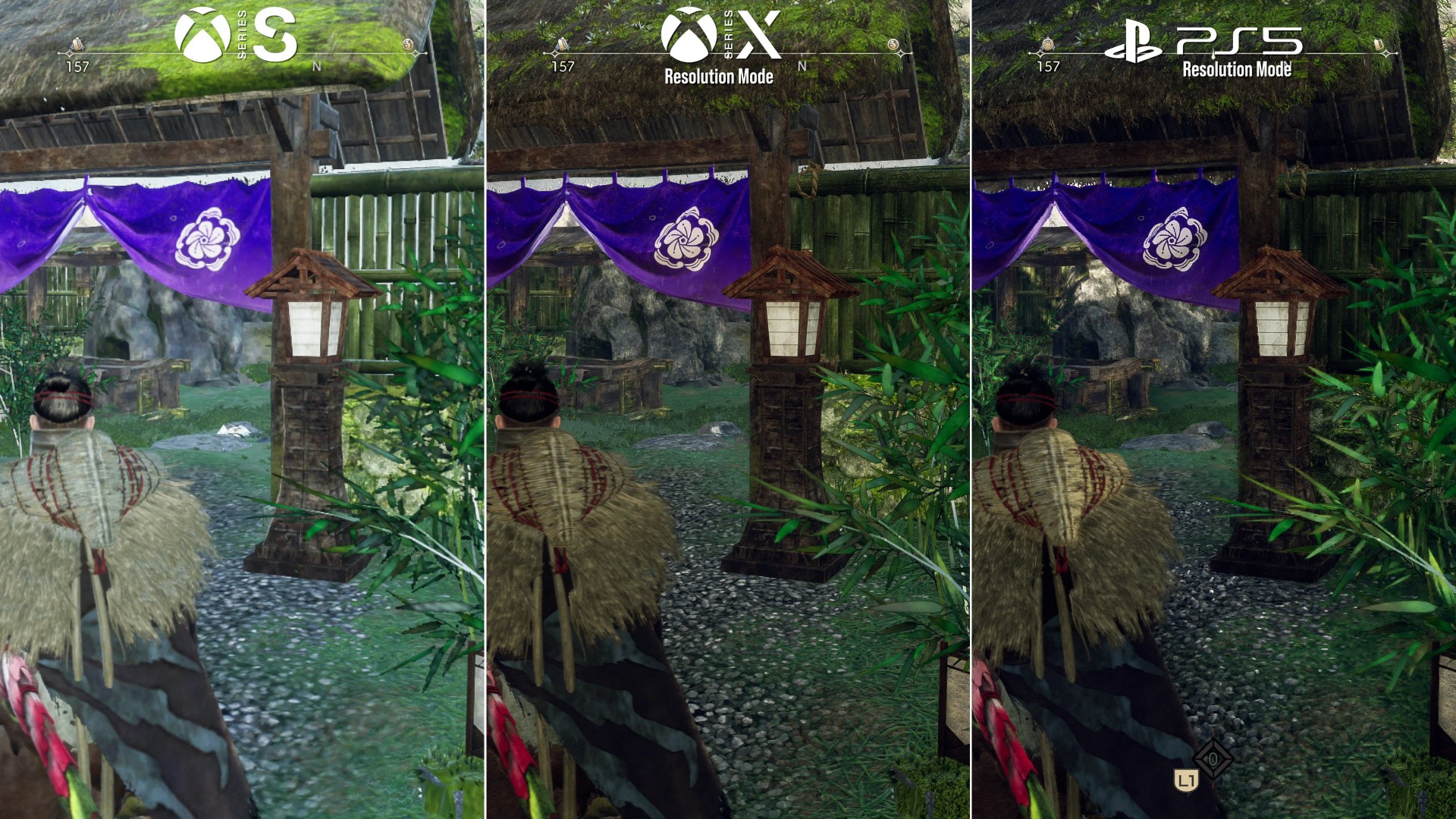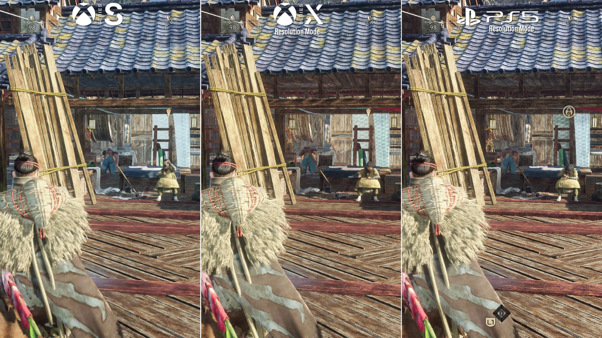 It's hard to overlook Wild Hearts' visual shortfalls, however. Firstly, texture-work doesn't hold up to scrutiny when viewed up close. Even on PS5 or Series X, asset quality for moss, wood, and brickwork use distractingly low resolution maps at times. Additionally, Xbox Series S uses even lower resolution textures than the premium consoles, producing some glaringly blurry surfaces. You may not notice in the heat of the action, but in getting from A to B there are some obvious rough spots. Likewise, the method of screen-space reflections (SSR) is of a low quality for all three machines: it's a flickering, pixellated, low resolution mirror image, with a huge gap around occluding objects. Again, Series S gets a particularly raw deal here, with an even lower accuracy setting than PS5 or Series X.