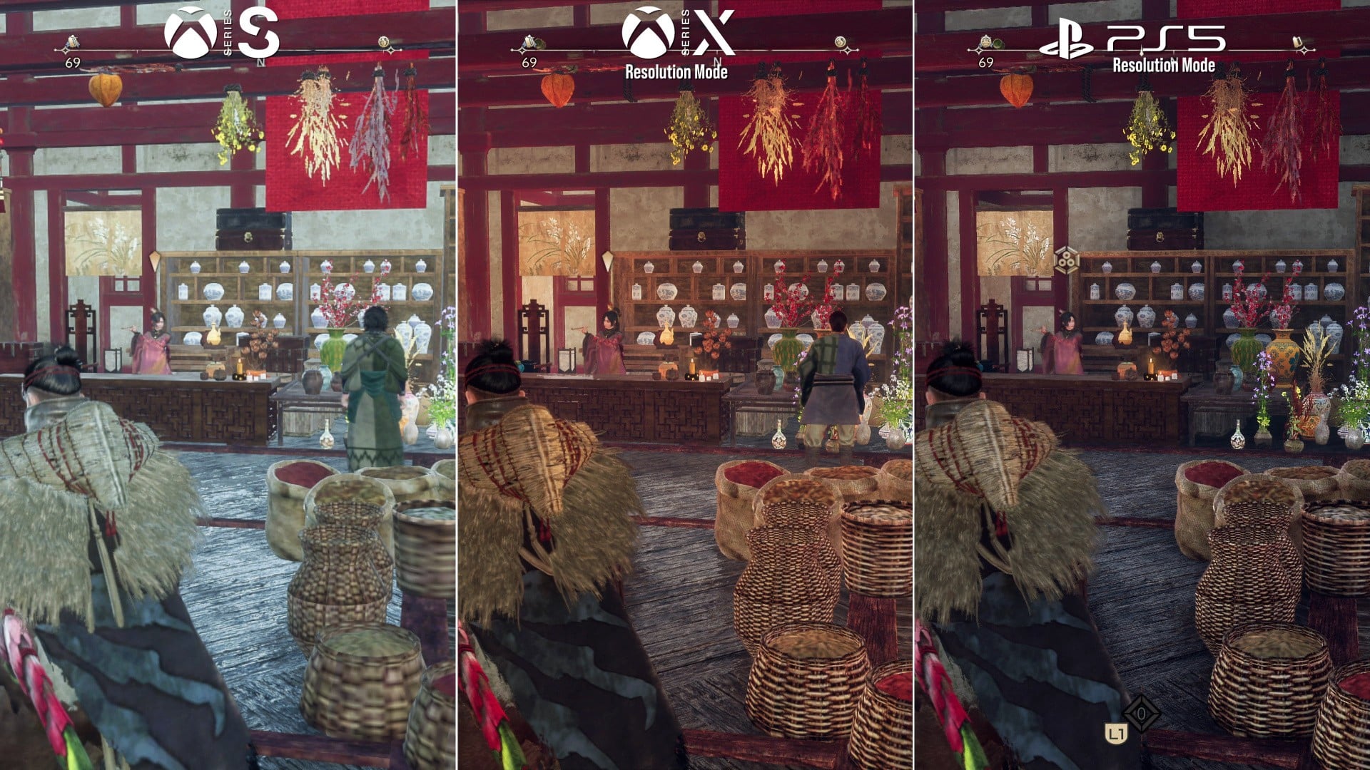 Suffice to say, PS5 and Xbox Series X get both modes - and yes, the visuals are broadly speaking identical across the two premium machines. The catch is, there are two huge exceptional points that favour each machine. First up, it's bad news for PS5 users. At least as of patch 1.02, there's a bug affecting image quality on PS5 - not present on Series X or S - causing its pixel structure to flicker constantly on its 4K resolution mode. This pixel crawl artefact affects some areas more than others, sticking out most glaringly around the Minato hub shrine. Even while stood perfectly still, in fact, any long high contrast edges tend to flicker aggressively. It's almost as if there's an issue with the upscale to PS5's 4K mode, as it switches between different resolutions values.