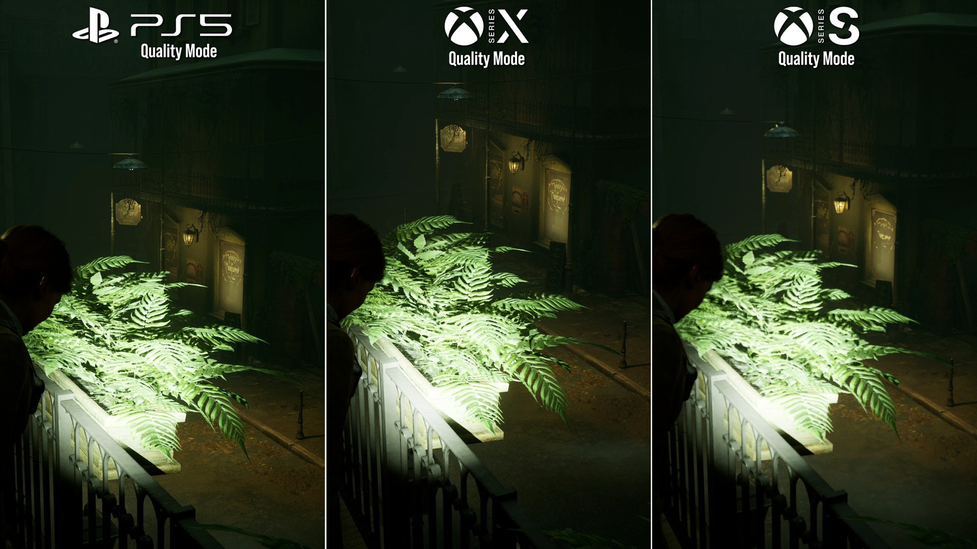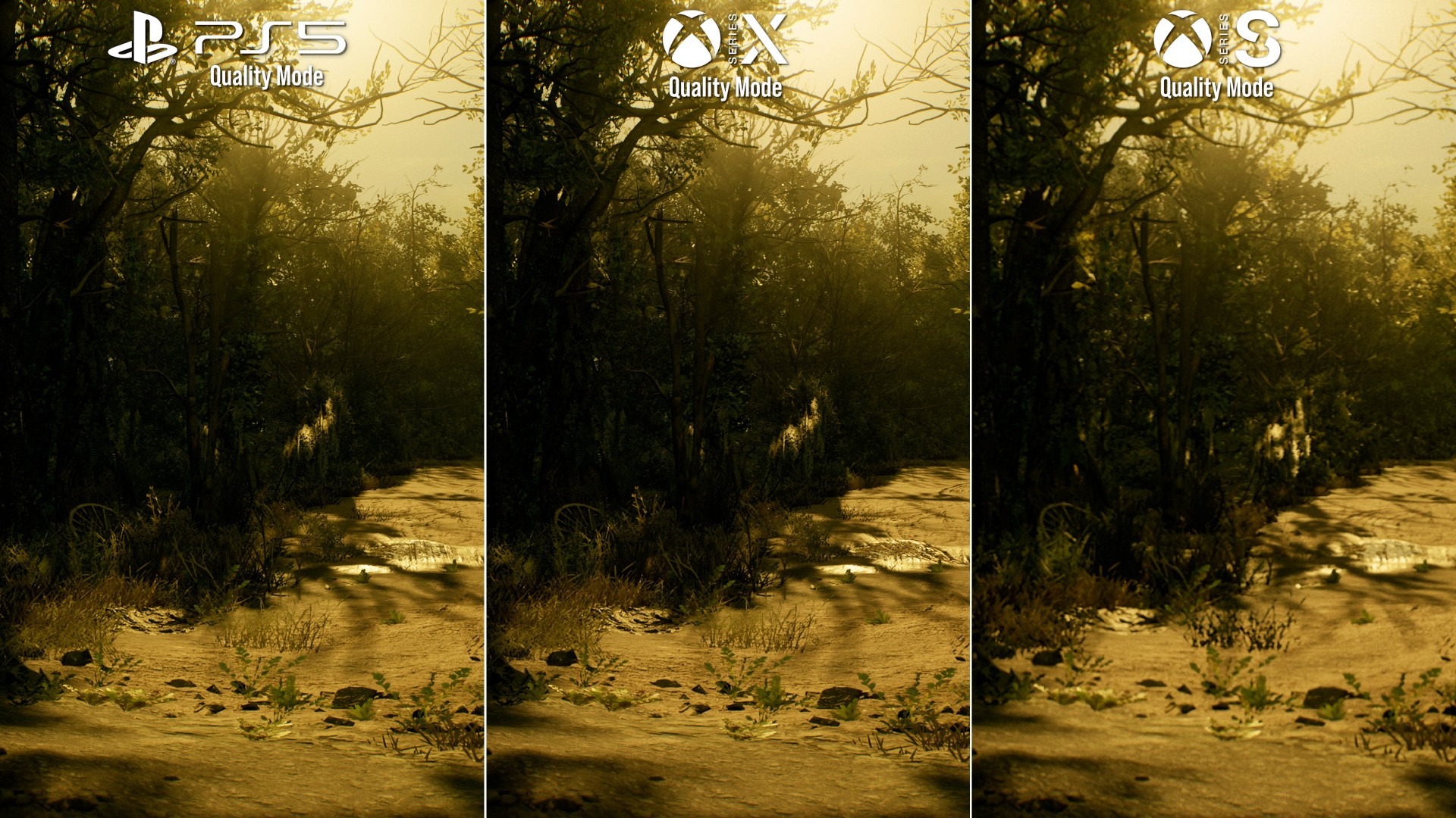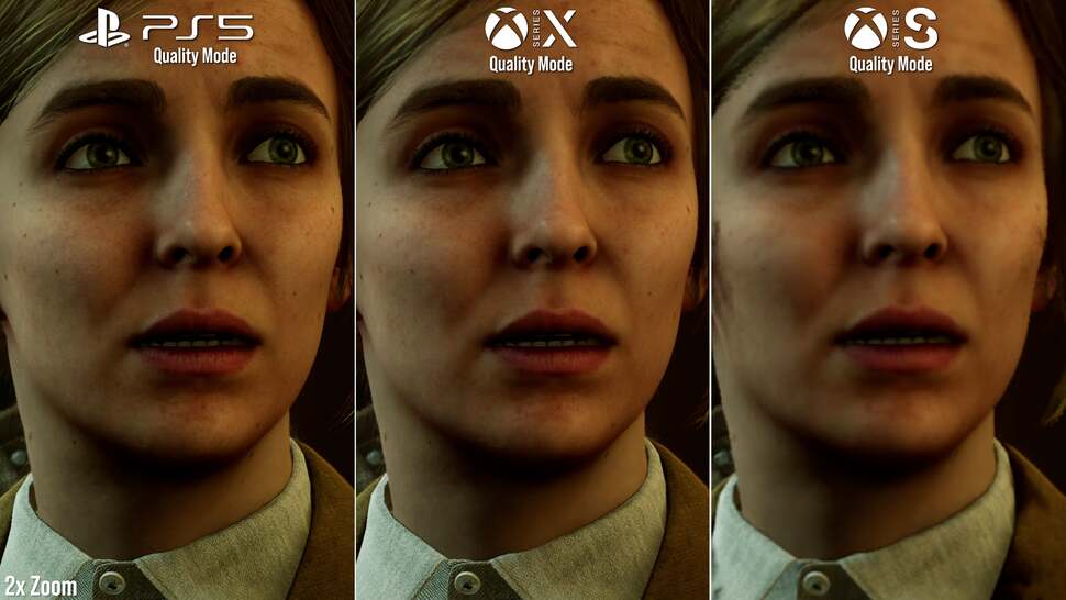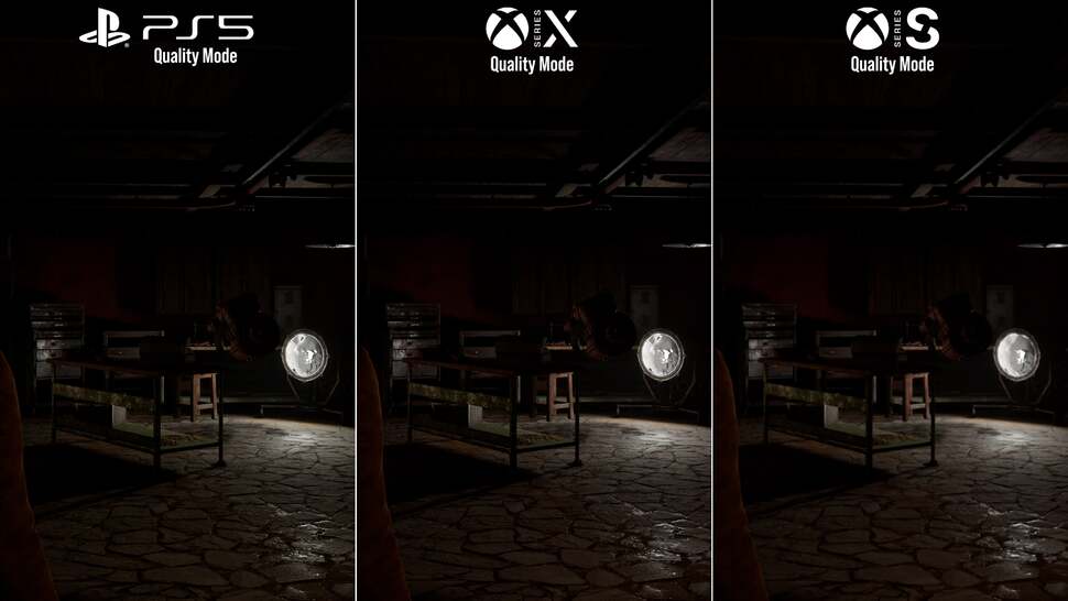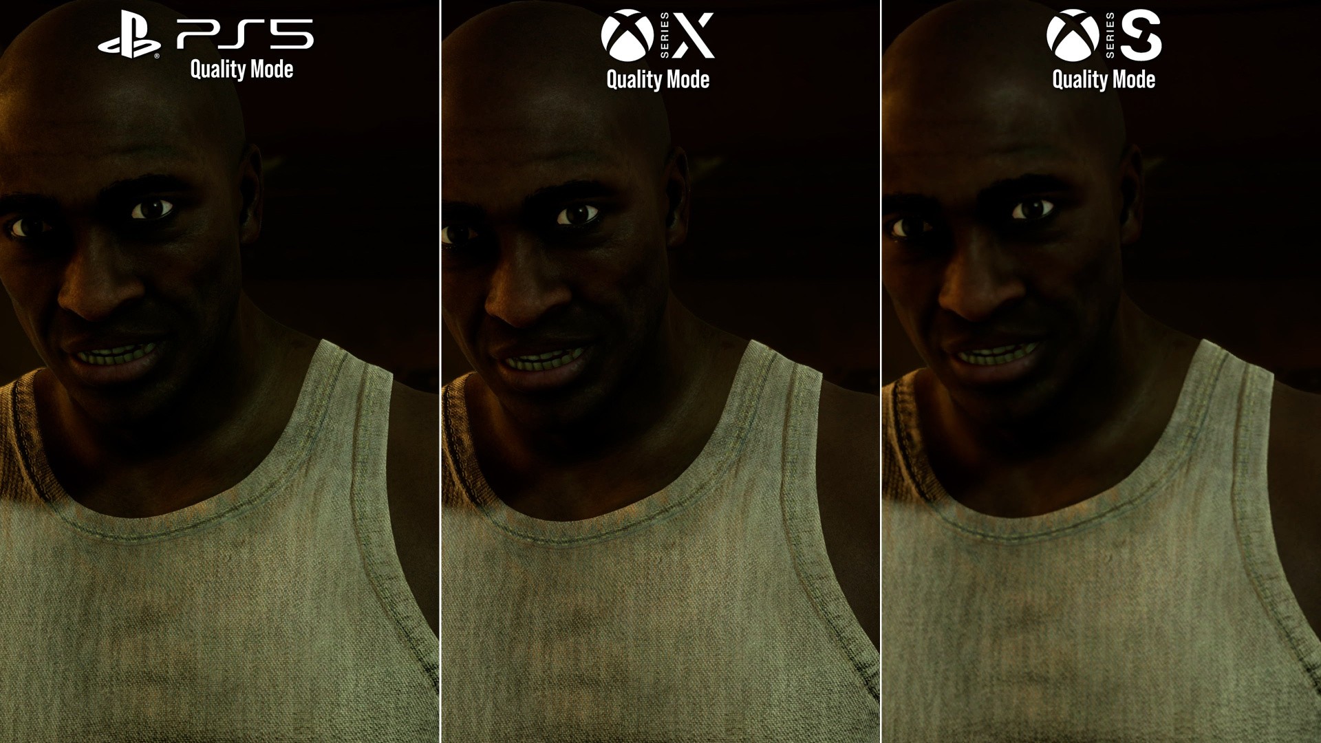 There's native 4K on PS5 and Series X quality modes, which is a great start. Typically it's at the full 3840x2160, though rare moments drop to 1836p in taxing cutscenes. On Series S though, we're typically at 900p, with no noted res drops under. The result, inevitably, is that the image is blurrier on Series S, while fine sub-pixel detail like facial hair is also lost in the upscale from 900p. PS5 and Series X are identical in settings as you might expect: in textures, shadows and beyond - though the Series S has a few other notable quality reductions.