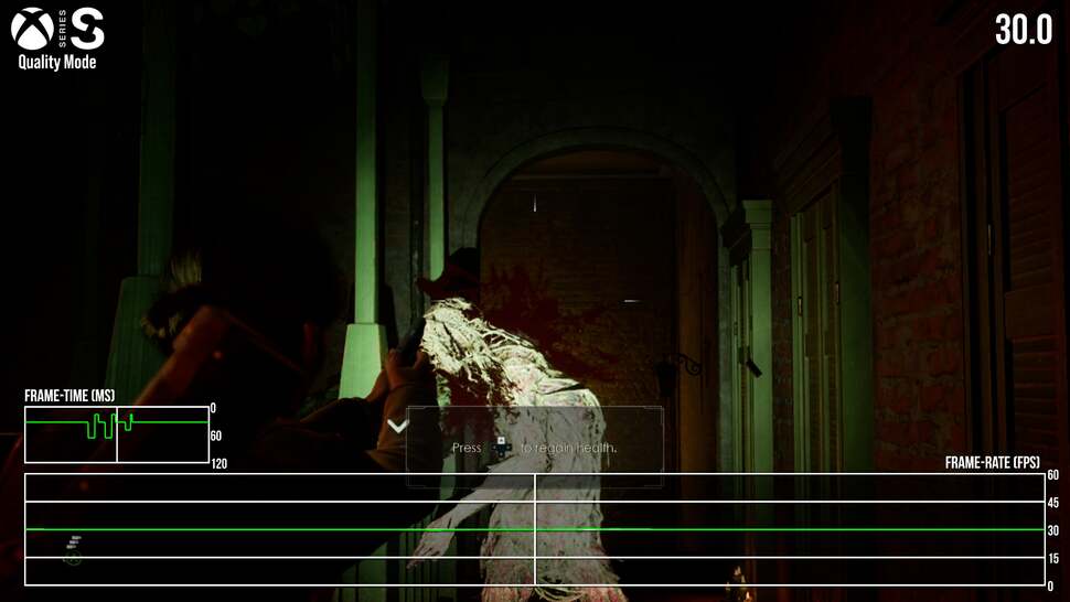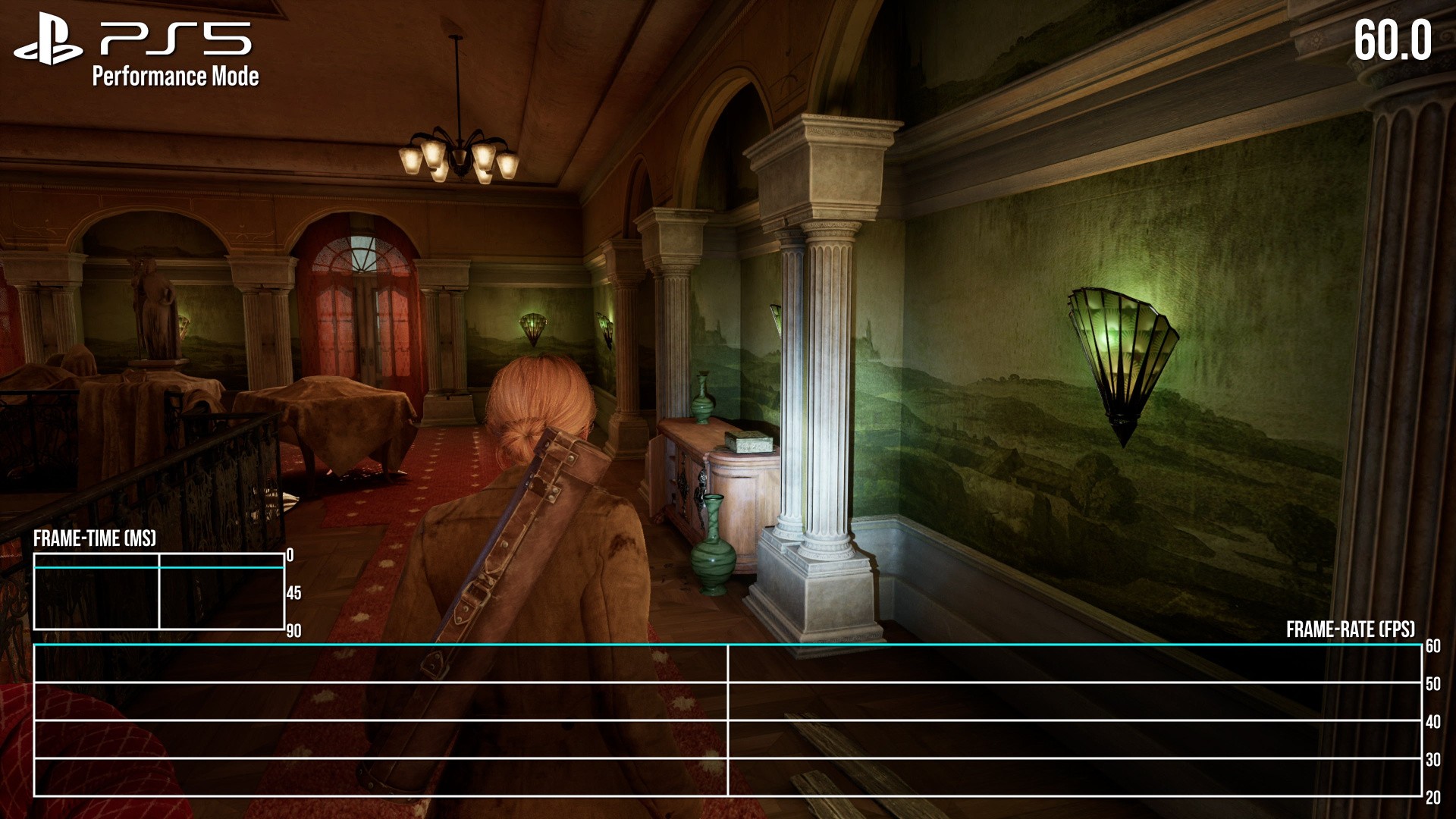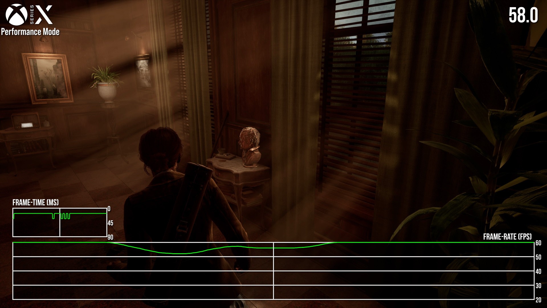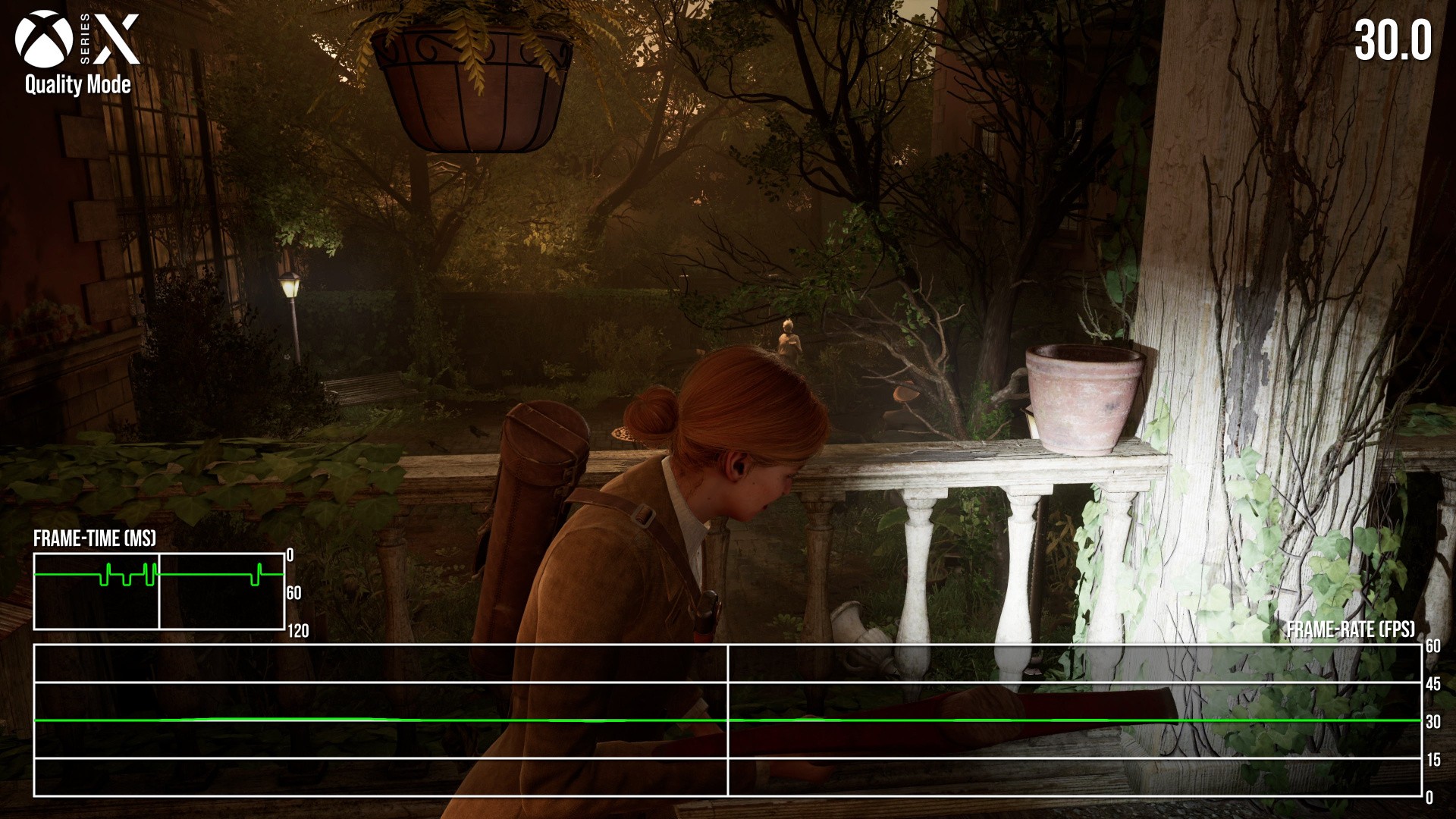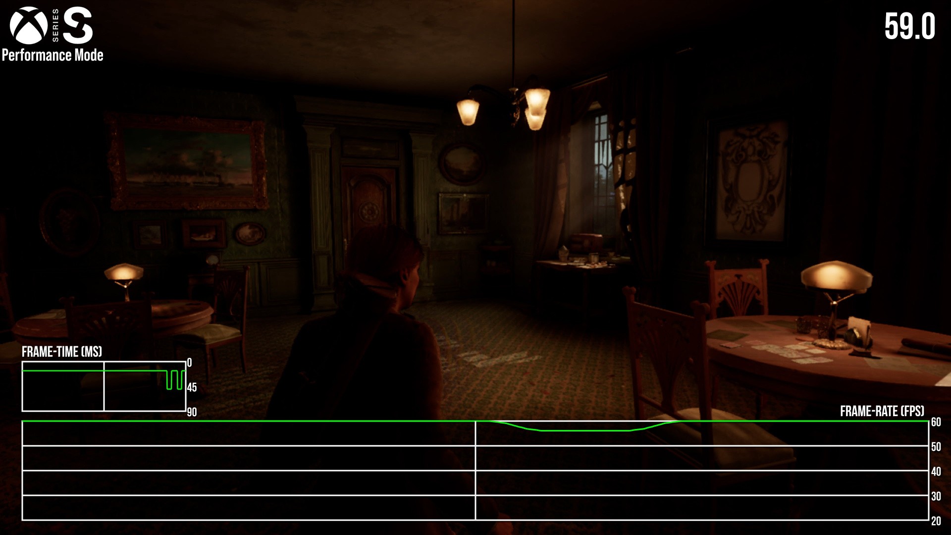 Switching to Xbox Series X on its performance mode, we're again faced with a dynamic 1080p to 4K range. Image clarity is in the same place as PS5 on average. There's a decent lock at 60fps mostly here too, except rapid movement is more of an issue on Series X. It seems that streaming assets between areas of the manor produces more hitches and frame-rate dips overall, at least based on the first three hours. In effect this manifests as larger clusters of dropped frames on Series X, just as we approach any new room. This only adds to the existing cases of hitching - in the marshland outdoors - that we see on PS5. It's an extra distraction the game doesn't really need, but mostly it is in the right place at 60fps.