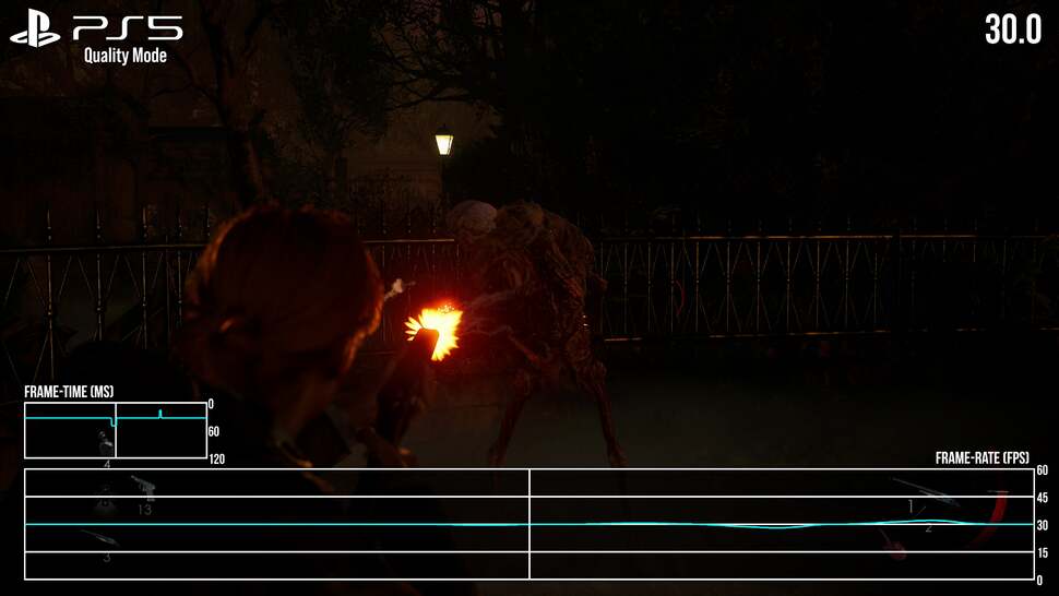 As for as the frame-rate itself, PS5's reading is often solid at 60fps, though expect single frame drops, and even occasional hitches in moving between areas. Notably, there's a streaming hiccup in a particular outdoors segment, always in the exact same spot, which is a little jarring. As for sustained drops, fire effects around enemies at times take us down to the 45fps line in the marshland of chapter two. Plus, several cutscenes push the machine well into the 40s. It's not a perfect return on PS5 but outside of these moments, the manor itself is usually optimised for 60fps at least.