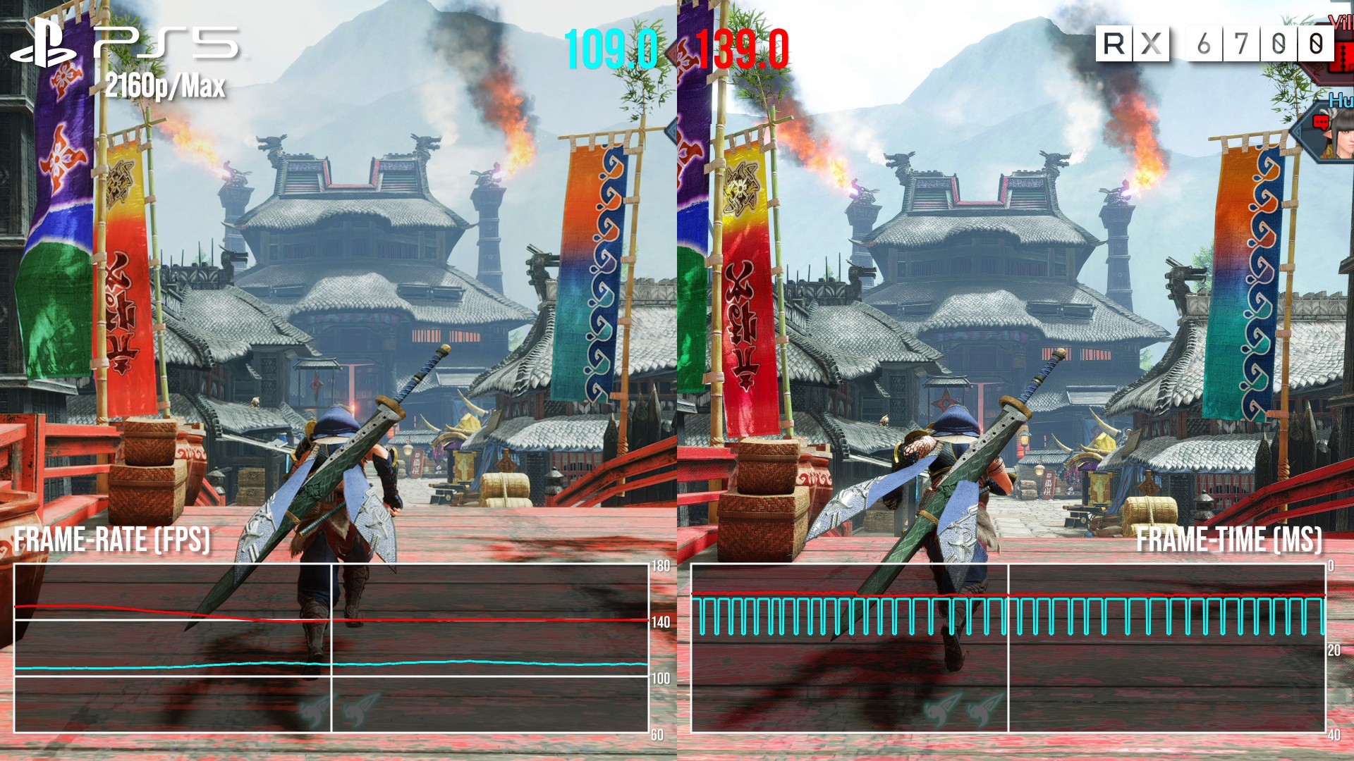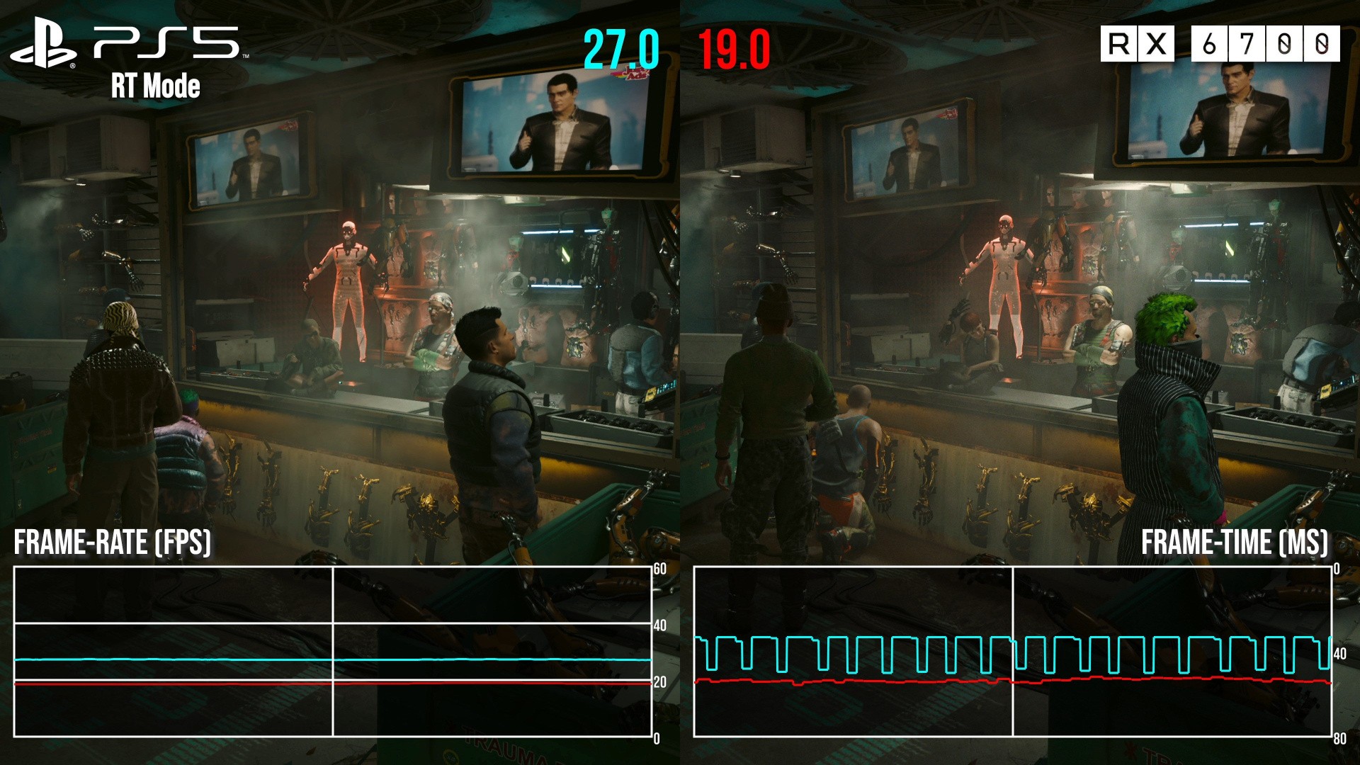Similarly, Monster Hunter Rise is a simplistic Nintendo Switch port, with an actual PC-style settings menu on PlayStation 5 - and the ability to render at both 4K resolution and supersampling down from 2700p (!). Here, the RX 6700 outperforms PS5 by around 32 percent and it's 30 points clear at 2700p. I'd say those are exceptions though and it can veer in the other direction. It's rare to find performance dips in Cyberpunk 2077 in the 30fps RT mode on PS5, but a part of the market in the Phantom Liberty expansion definitely has issues - but not as many issues as the RX 6700. The PS5 outperforms is by 45 percent - a remarkable state of affairs that is not matched in performance mode, where the 6700 seems much the same as PlayStation 5.